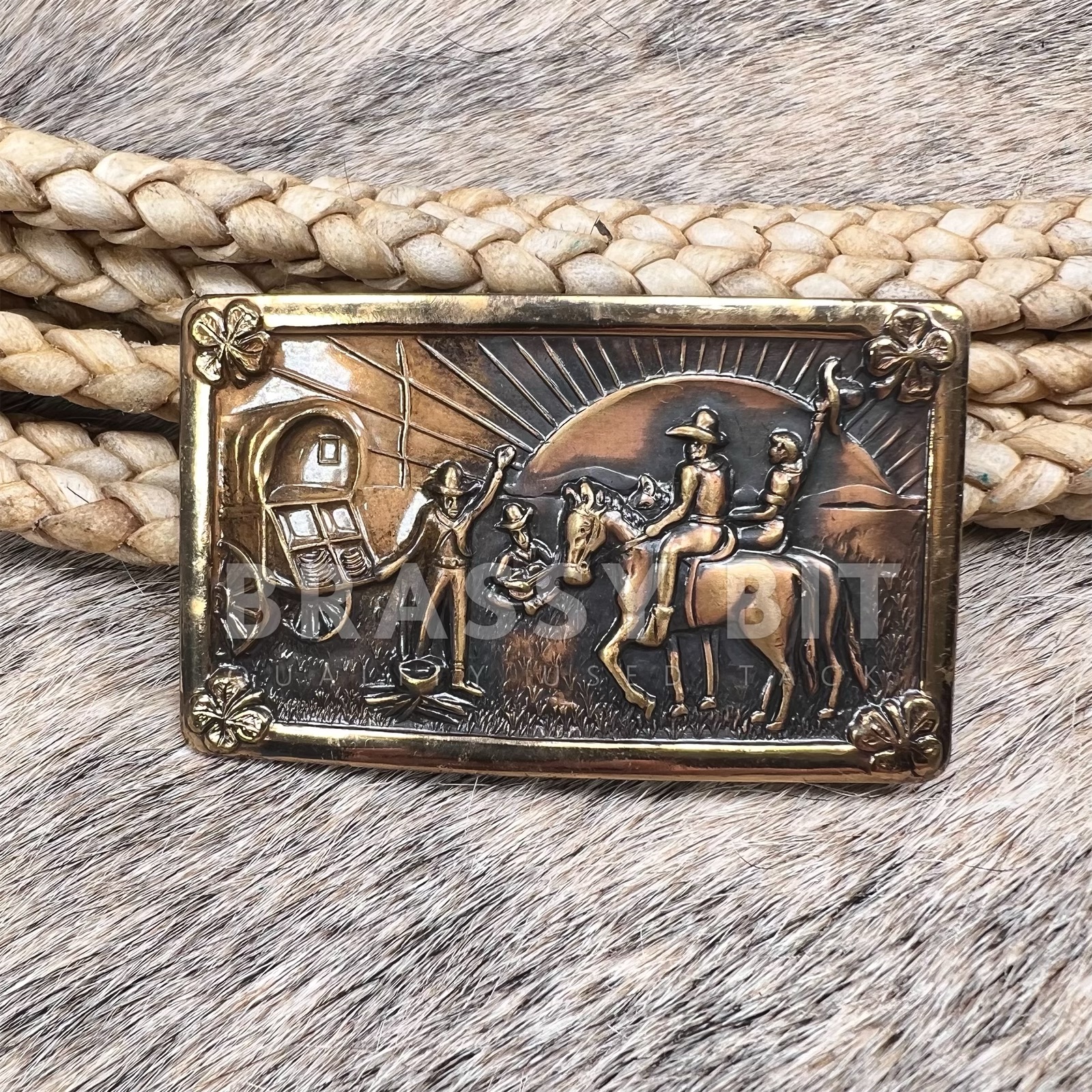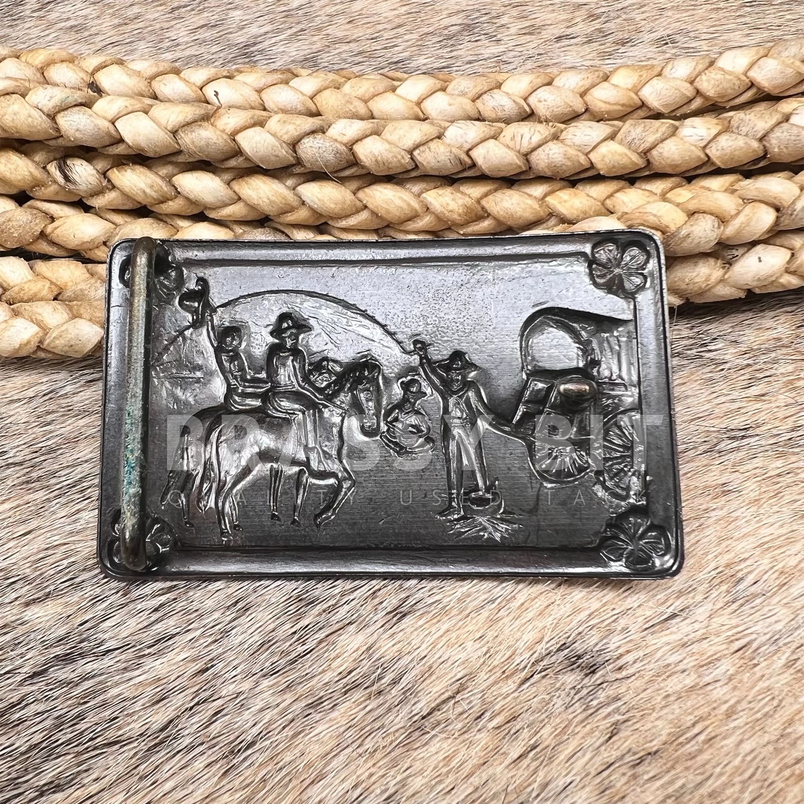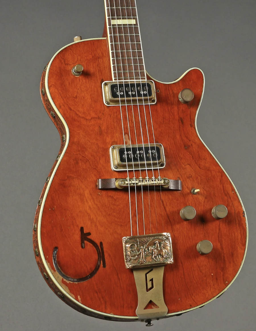 This buckle is a literal piece of music history….yes, seriously! Designed as a decal addition to the famed 6130 Roundup Guitar by Fred Gretsch, which was the first introduction of a solid body guitar that was finished in the now iconic orange varnish. The overall style of the guitar was based upon the romantic concept of the “Old West” and by-gone musical eras, with unique design features that included a tooled leather strap, his brand literally branded into the wood, pearl accents, inlayed steer head….and the tailpiece a literal belt buckle—THIS belt buckle. The buckle is from Vogel in copper, and adorned these classic guitars from 1953-1957. Only three buckle designed were used and were trade marked by Vogel and Gretsch for this team-up. While it was designed as a western flare accent for these amazing guitars, the buckle was also designed to be sturdy enough to use. Additionally, some Gretsch amps also had these cool buckles. This is an original, authentic buckle. Not marked as typical of the early years, only showing the Vogel stamp starting in late 1954. Measures 3 1/8” long, 1 7/8” wide, fitting a belt up to 1 5/8”. Ready to use, add to your collection, or finish off your guitar. A great price, leaving you plenty in your pocket to afford the $15k price tag for a 1953-1957 Gretsch Roundup guitar.