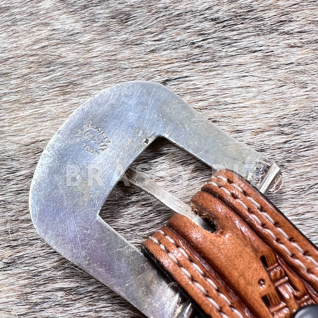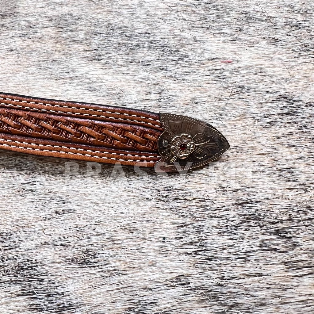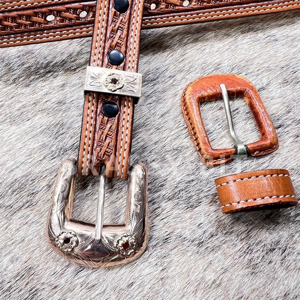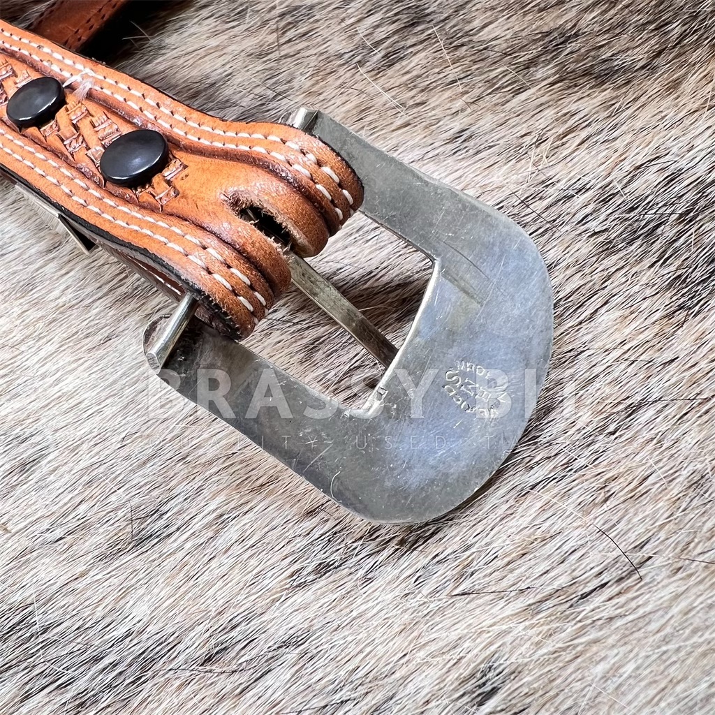 Here is a fantastic belt from Vogt! A house hold name even outside the equine community. The belt is in near pristine condition, medium oiled leather with basketweave tooling. Comes with the original leather wrapped buckle and leather keeper, currently with a stunning, vintage buckle set that is solid sterling silver with inlayed authentic rubies. The top of the buckle has a gold tone hue, giving it a really unique look. The buckle set is a vintage set (3 pc) but is in incredible condition. Belt Measurements: Marked 34″, total measurement without buckle 40″, with buckle 41 3/4″, holes at 33 1/2″-36 1/2″. 1 1/2″ wide, 15/16″ wide at buckle and tail end. Buckle will work for a belt up to 1″. Buckle is marked AMS Made in Mexico, Sterling. Really lovely set here!