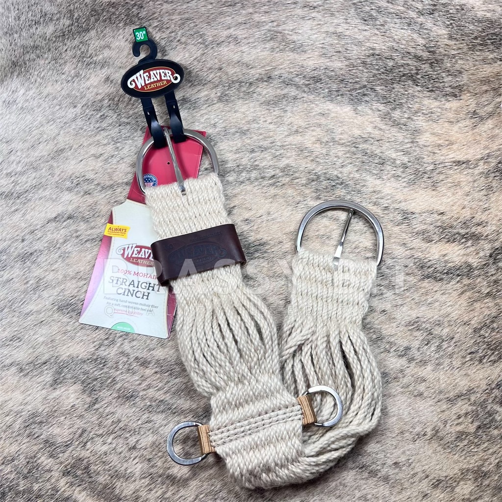 Weaver Leather 100% Mohair 27-Strand Straight Cinch Handcrafted by craftspeople in Holmes County, Ohio, this premium quality double strand straight cinch is made from 100% mohair from Angora goats. This mohair offers a soft, luxurious feel, a rich luster and outstanding durability. Known as “the diamond fiber”, mohair can be twisted and bent without causing damage adding to the dependability and durability of this cinch. Mohair wicks away moisture for added comfort to your horse and for maximum breathability. While mohair cinches are known for stretching for a perfect fit, they always return to their original size due to the fiber’s elasticity. This cinch also offers easy care! Dust and dirt can generally be removed by shaking and brushing the cinch. Sunset harness leather off billet holder. Non-rust stainless steel hardware.