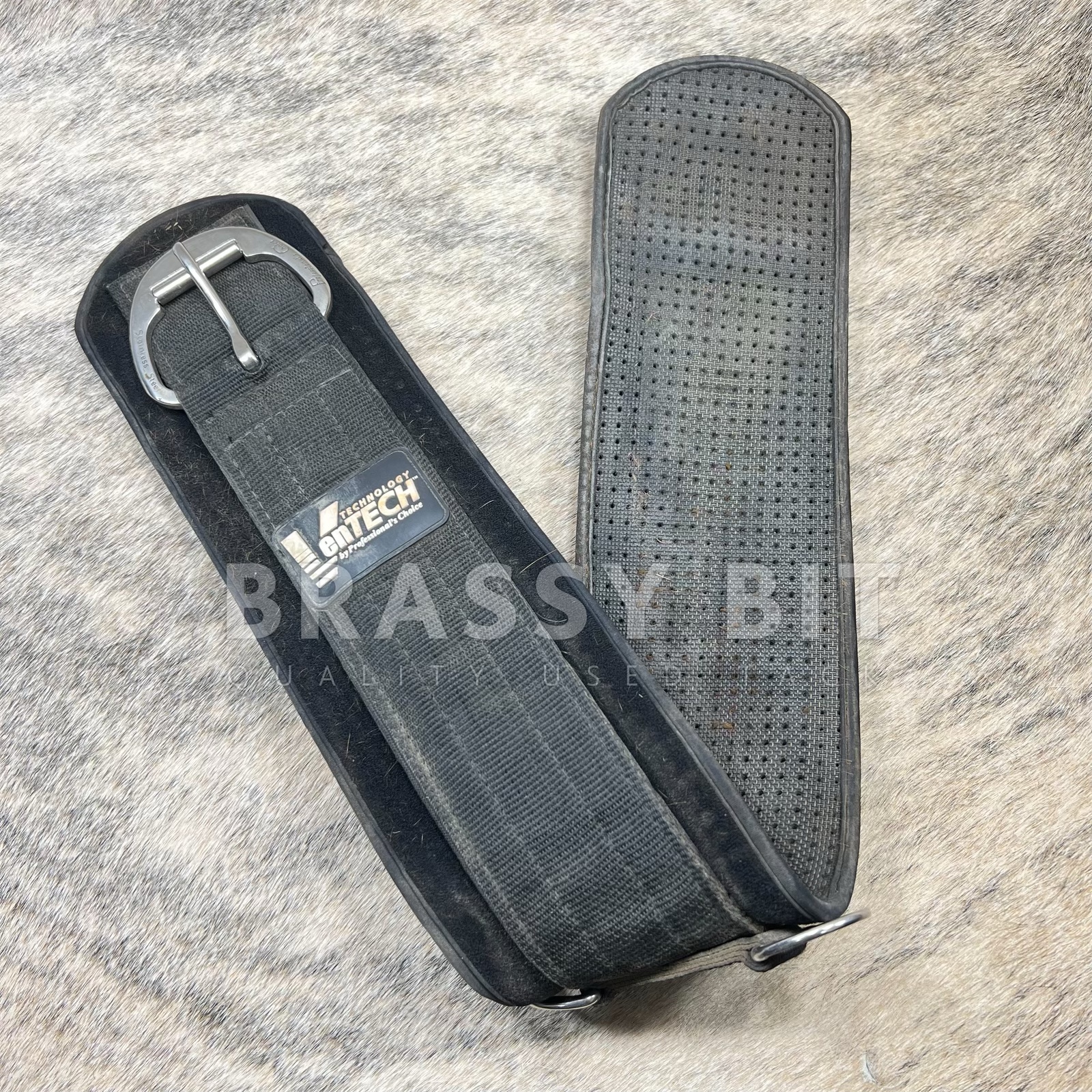 These cinches are perfect for easy cleaning! They have an all neoprene underside, which can clean in a quick swipe! The liner is removeable for easy cleaning, or to change to a different material. This 32″ Pro Choice SmX VenTech cinch is used, but not used up. Shows a bit of creasing from being stored on a saddle, some hair in the vent holes, some discoloration, but overall is in good used condition. All stainless steal hardware, standard width, and so affordable!