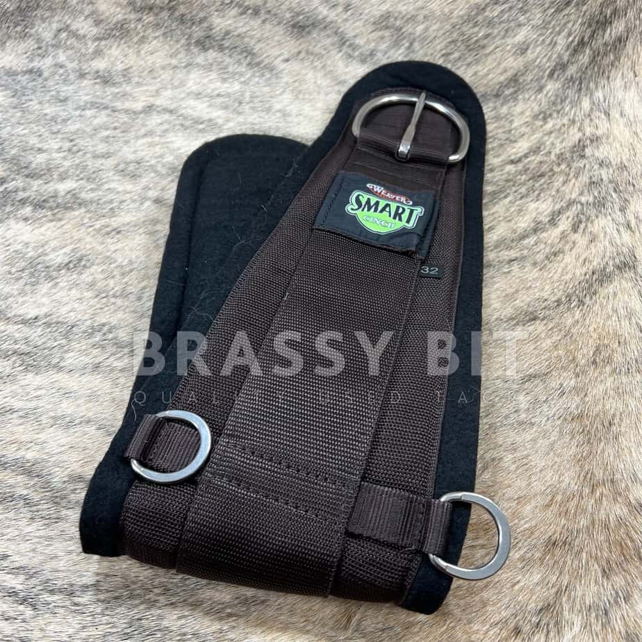 Weaver Straight Wool Smart Cinch This cinch features a breathable 1/2″ wool blend natural felt bottom with a black poly webbing top. Features the patented Roll Snug Cinch Buckle that makes cinching a breeze. Nylon off billet holder. Features: Patented Roll Snug Cinch Buckle Nylon off billet holder Item Specifications: Black poly webbing top Wool blend natural felt bottom