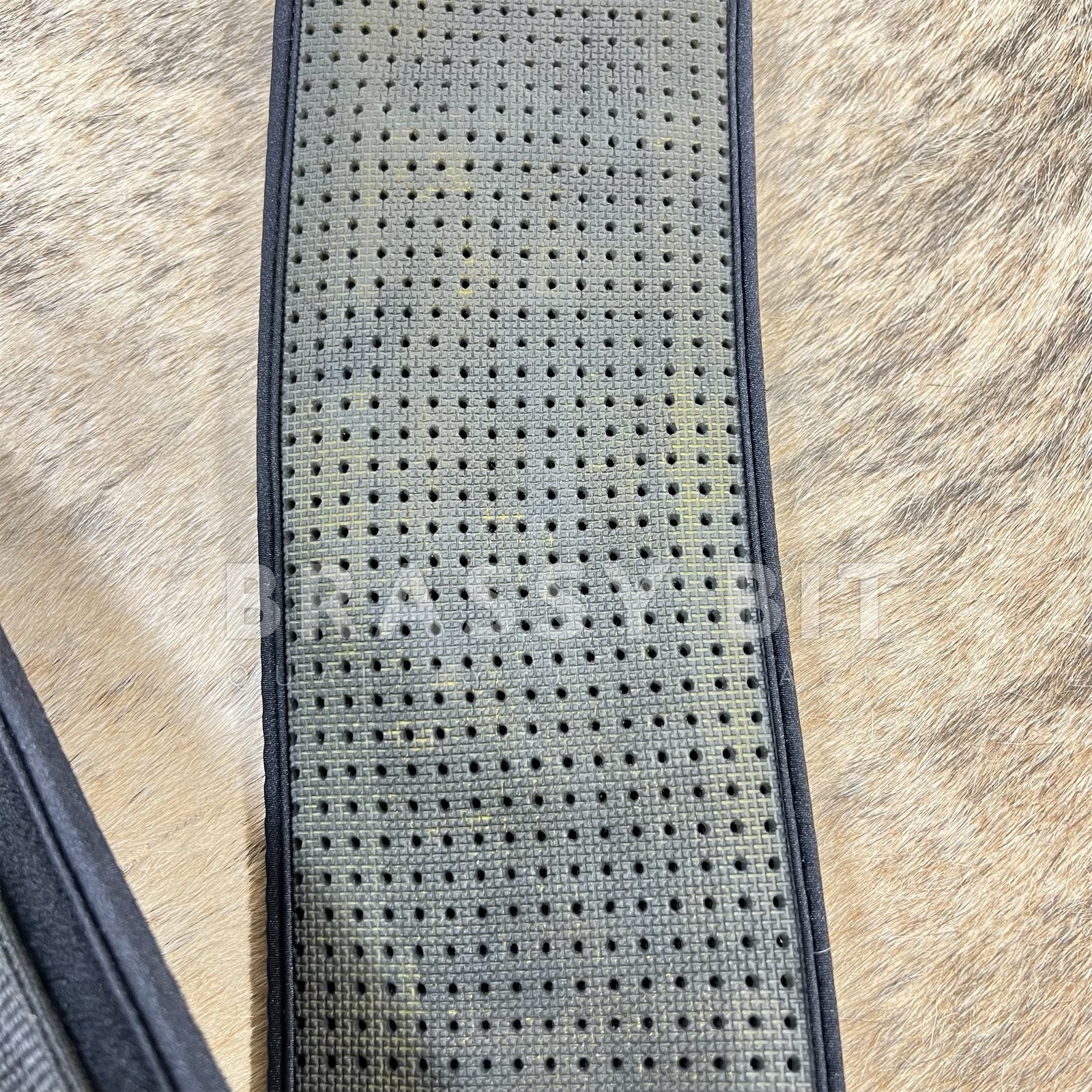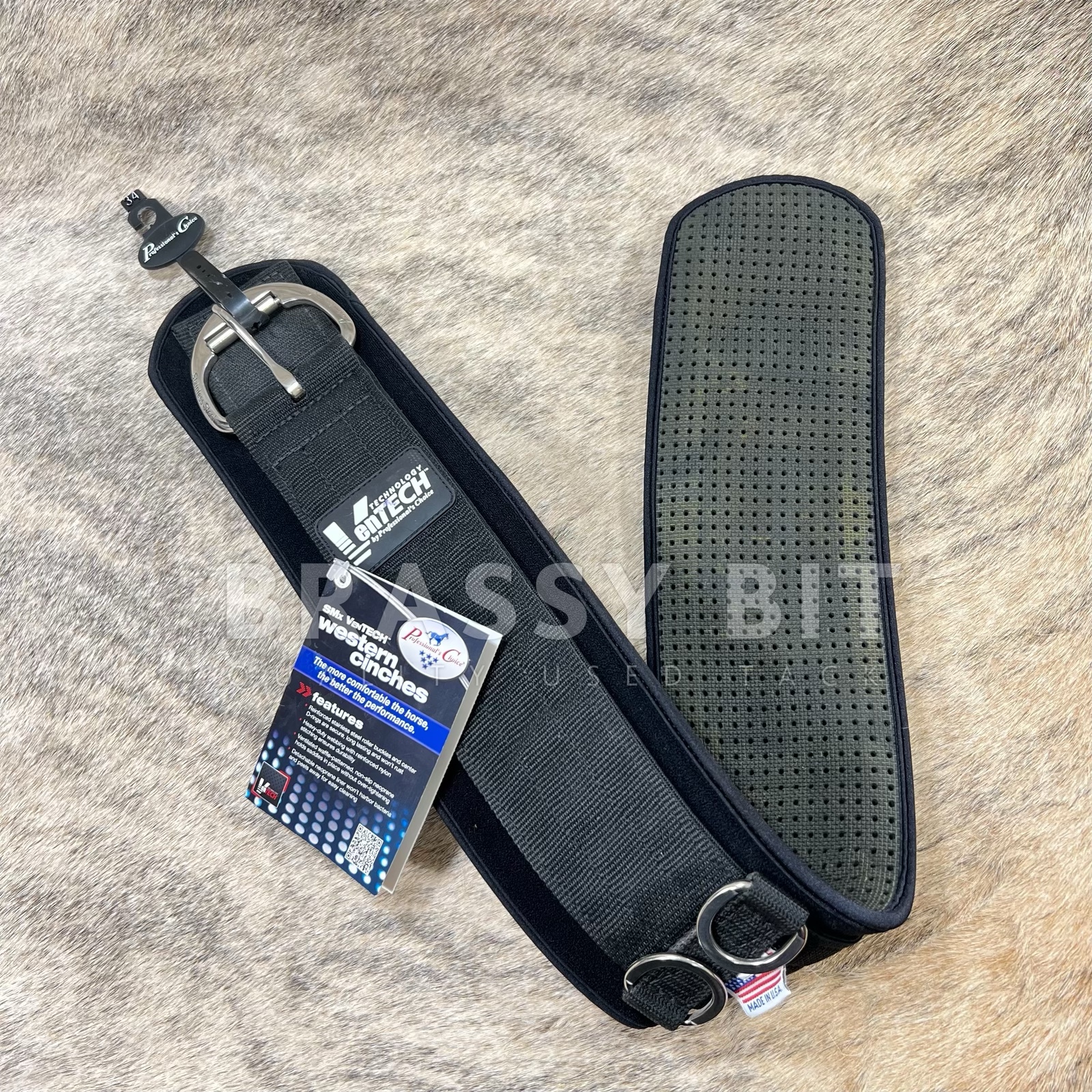 These cinches are perfect for easy cleaning! They have an all neoprene underside, which can clean in a quick swipe! The liner is removeable for easy cleaning, or to change to a different material. This 34″ Pro Choice SmX VenTech cinch is with with tags, new old stock. We are calling this one “demo” condition, as it has some faint color transfer and a small indent from being stored with other tack. It is new with tags, never been used. Â All stainless steal hardware, standard width, and so affordable!