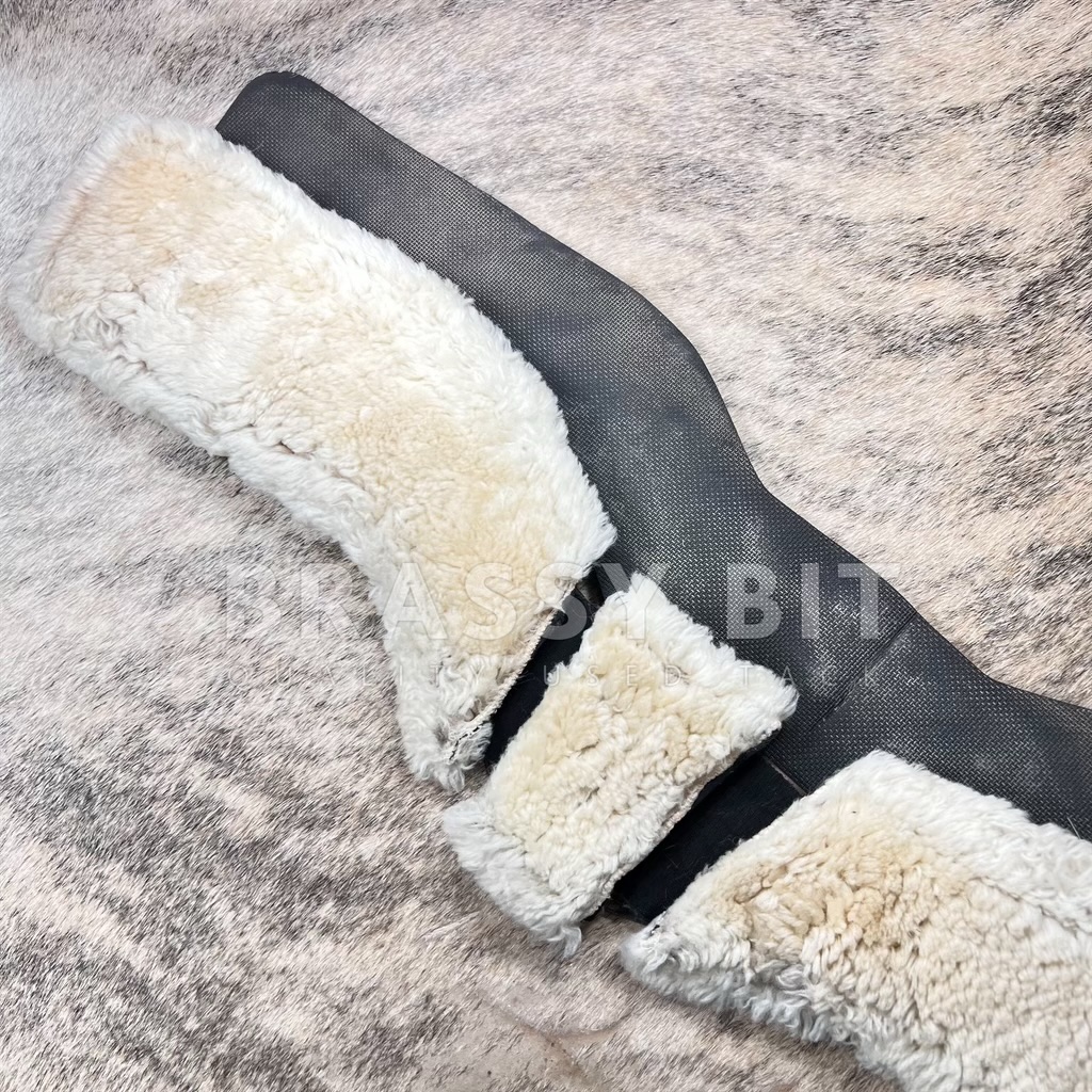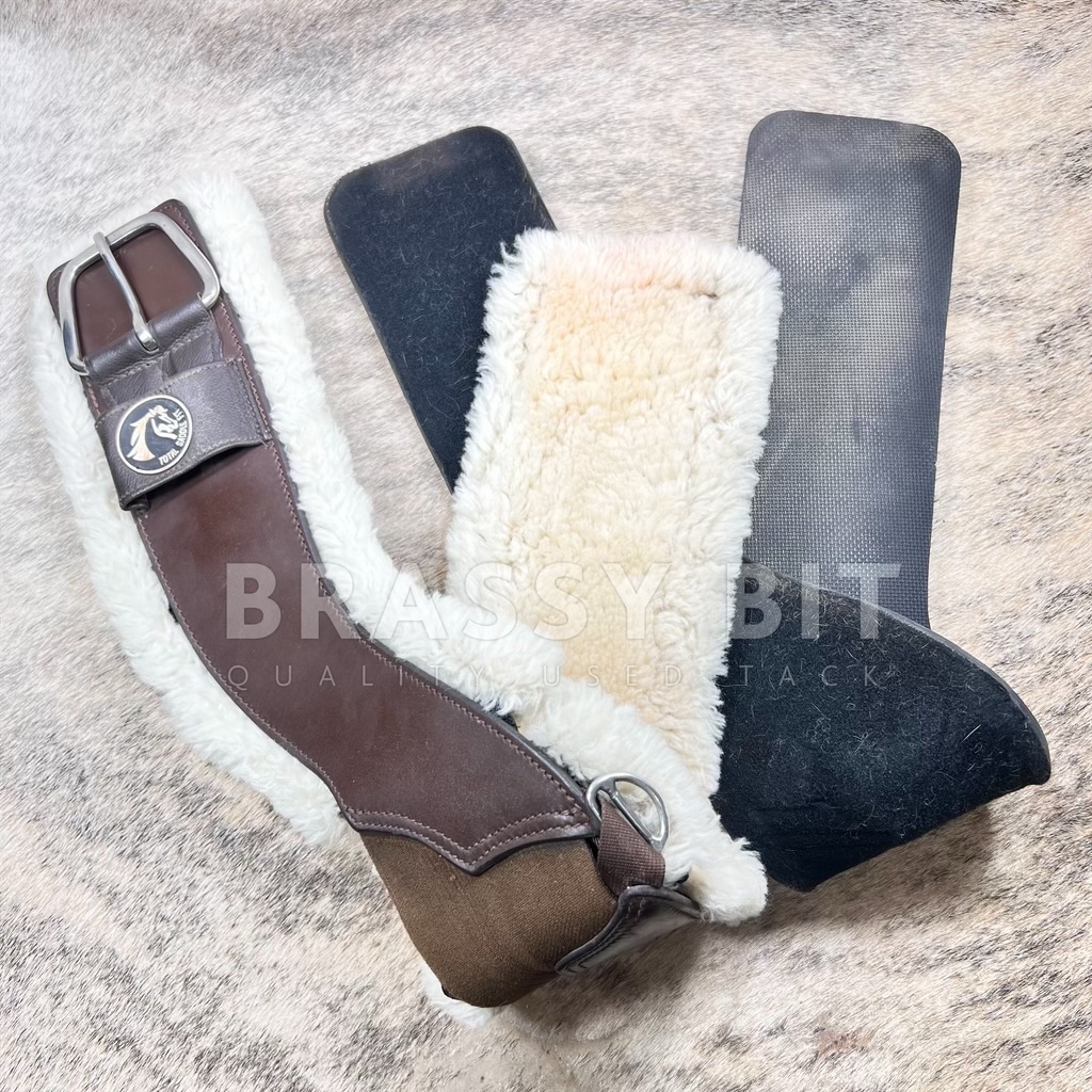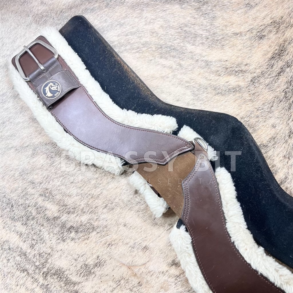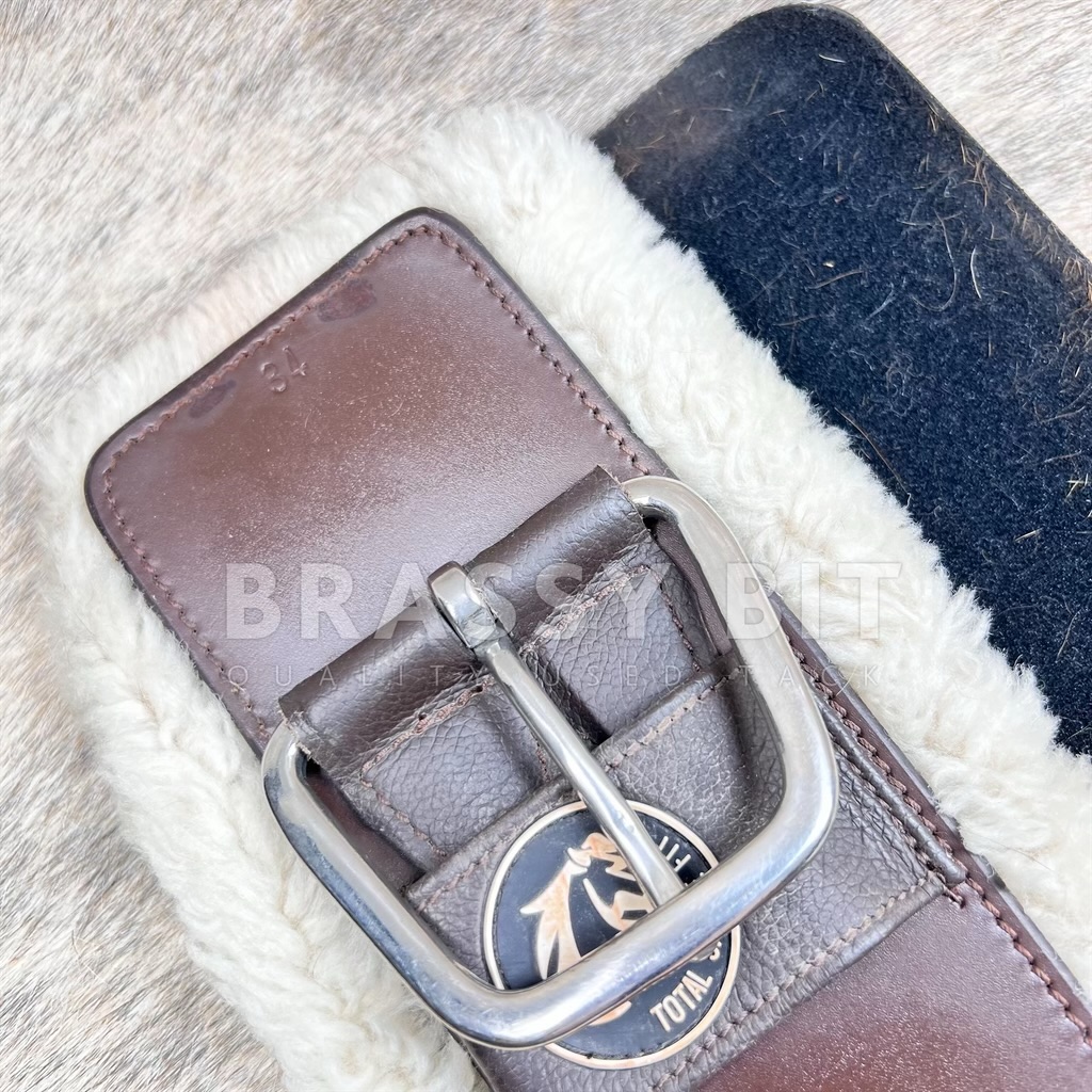 Very nice used 34″ brown Total Saddle Fit Stretch-Tech Cinch! Comes with neoprene removable liner AND fleecy wool liner. We love the Stretch-Tech cinches as the center elastic insert helps prevent over-cinching and helps the cinch move with your horse. Overall this set is in very good used condition. Neoprene liner shows very little use. Fleecy wool liner has been more used, with some very minor wear along the edges. Has been laundered. Cinch itself is in very good used condition. Comes as a set with the two liner! Per TSF: