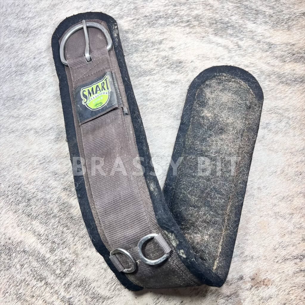Here is a nice used felt straight Smart Cinch from Weaver, offered far less than retail. 34″ x 5″ wide. With Snug Buckle. Felt cinches are one of our favorites, as they are from felted wool, which wicks sweat well, is soft on the skin, and supportive. In good used condition. This one has only been used a few times, but used on a muddy/not well brushed horse, so looks more used than it actually is. A good wash will do this one wonders. Per Weaver: