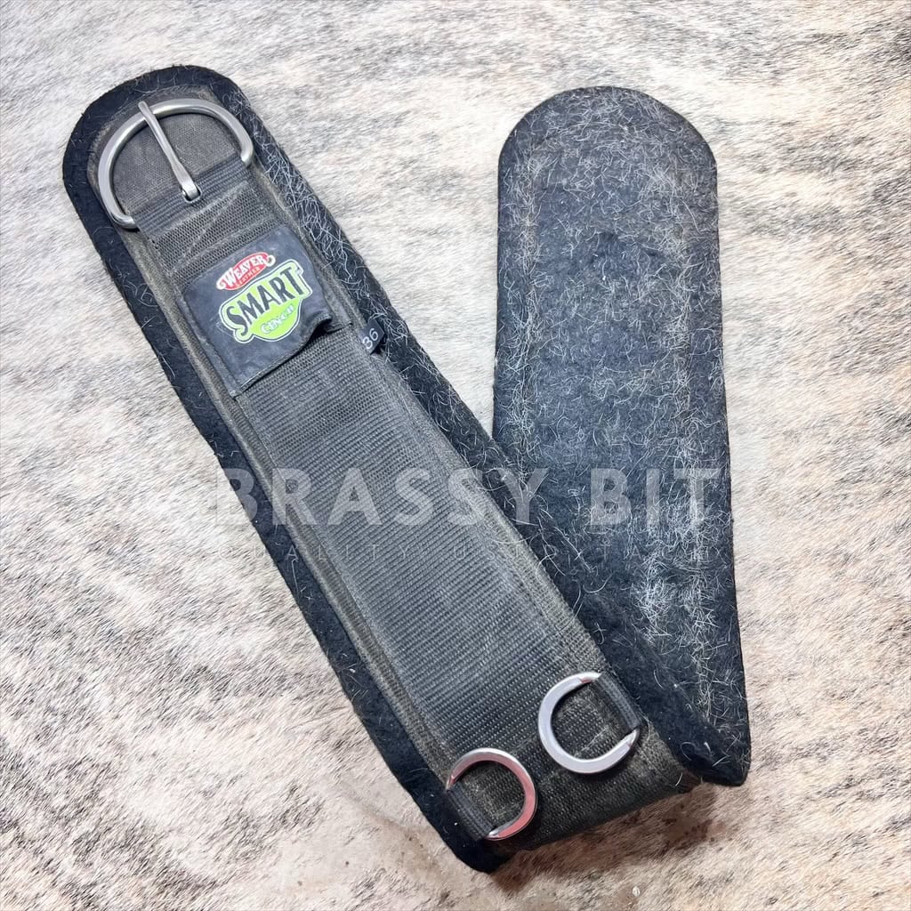 Here is a nice used felt straight Smart Cinch from Weaver, offered far less than retail. 36″ x 5″ wide. Felt cinches are one of our favorites, as they are from felted wool, which wicks sweat well, is soft on the skin, and supportive. In good used condition, is a bit dusty and shows minor pilling. Would benefit from a good wash. Per Weaver: