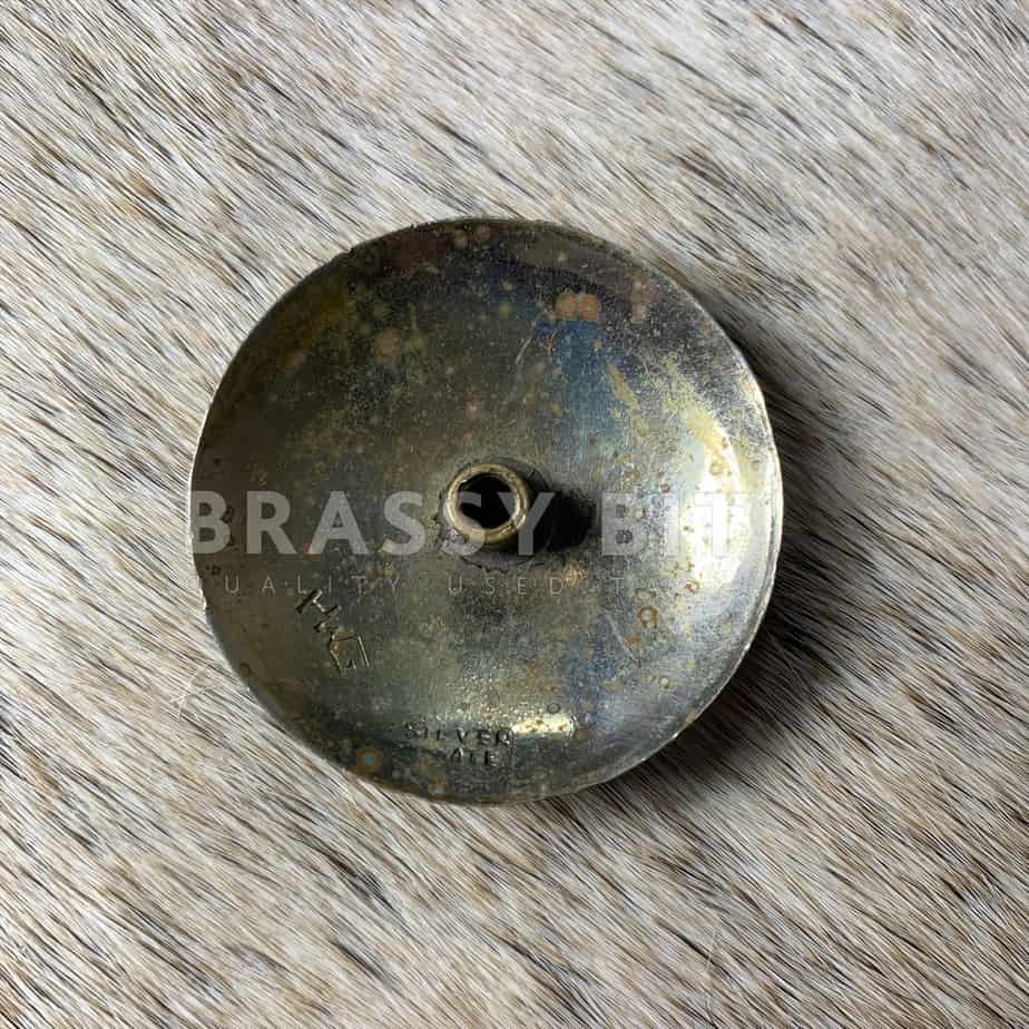 Here is an absolutely beautiful screw back saddle concho. In a more modern style, with great detail. Screw back, 1.5″, doesn’t have this screw on it but threads are good to add a screw of your choice. Marked HAG and silver plate.