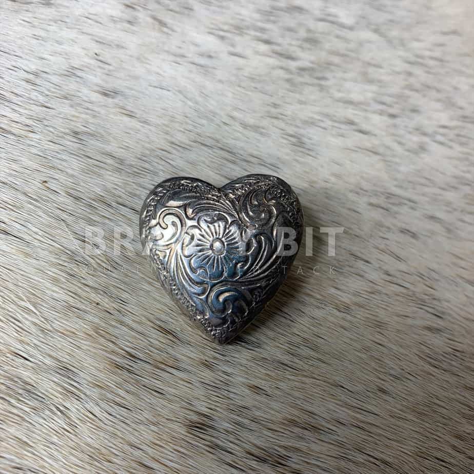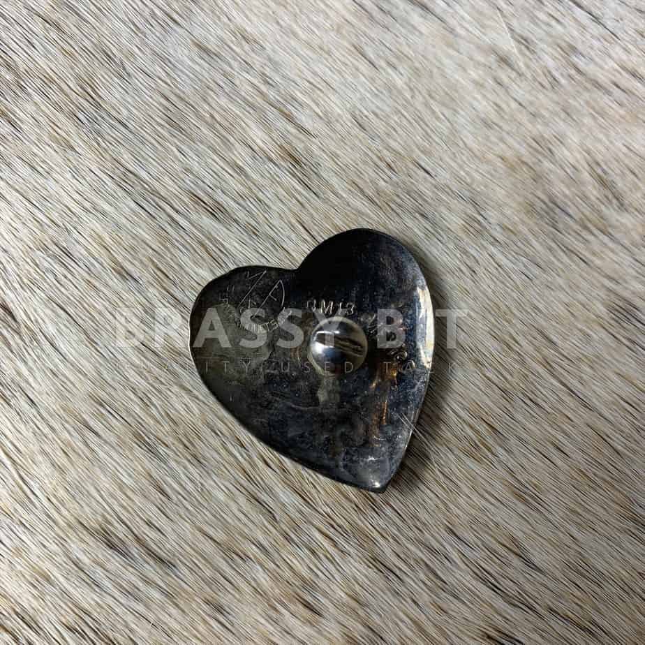 Here is an absolutely beautiful vintage screw back concho. 1″ heart with a smaller screw back but could have a larger screw post put on for a saddle. Marked M3F Era Products Inc, GM13 Mexico. Likely silver overlay or silver plate. In very good condition, only showing tarnish appropriate with vintage silver. Floral engraved.