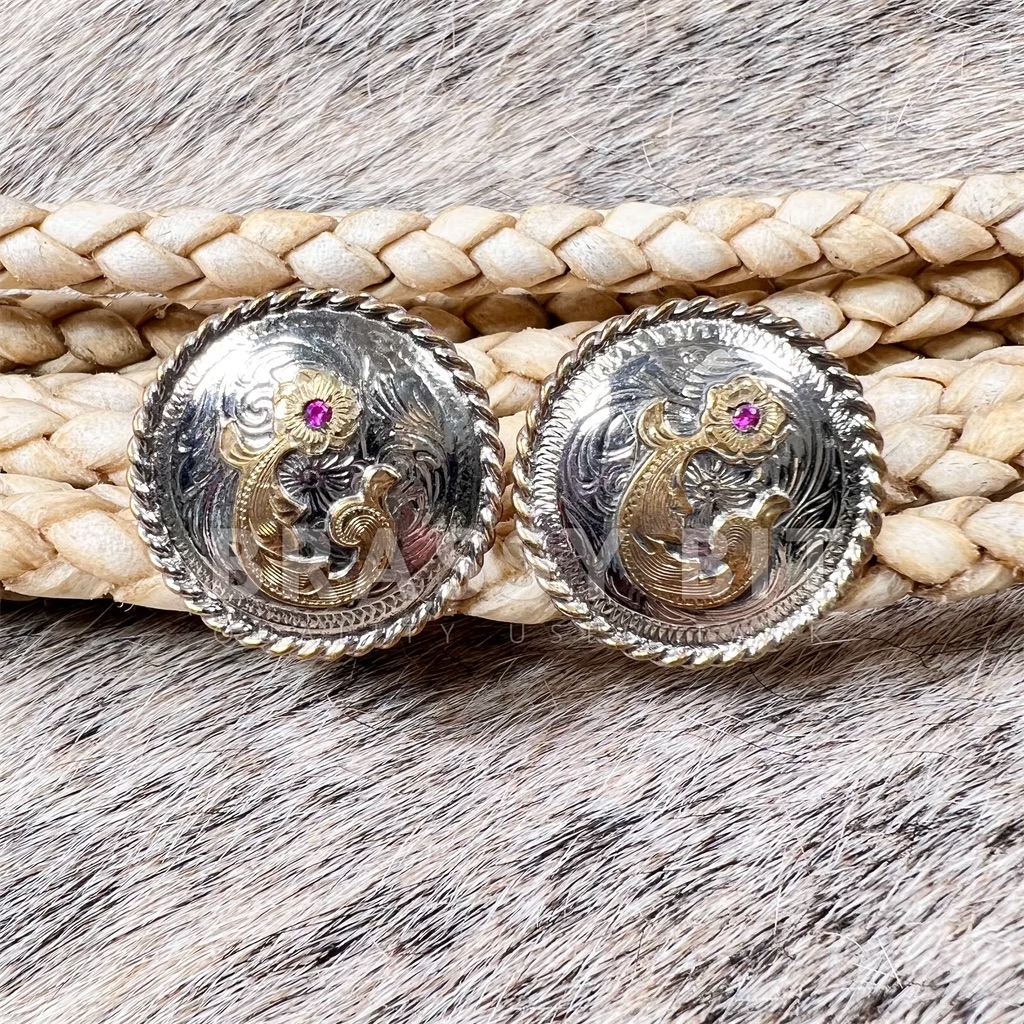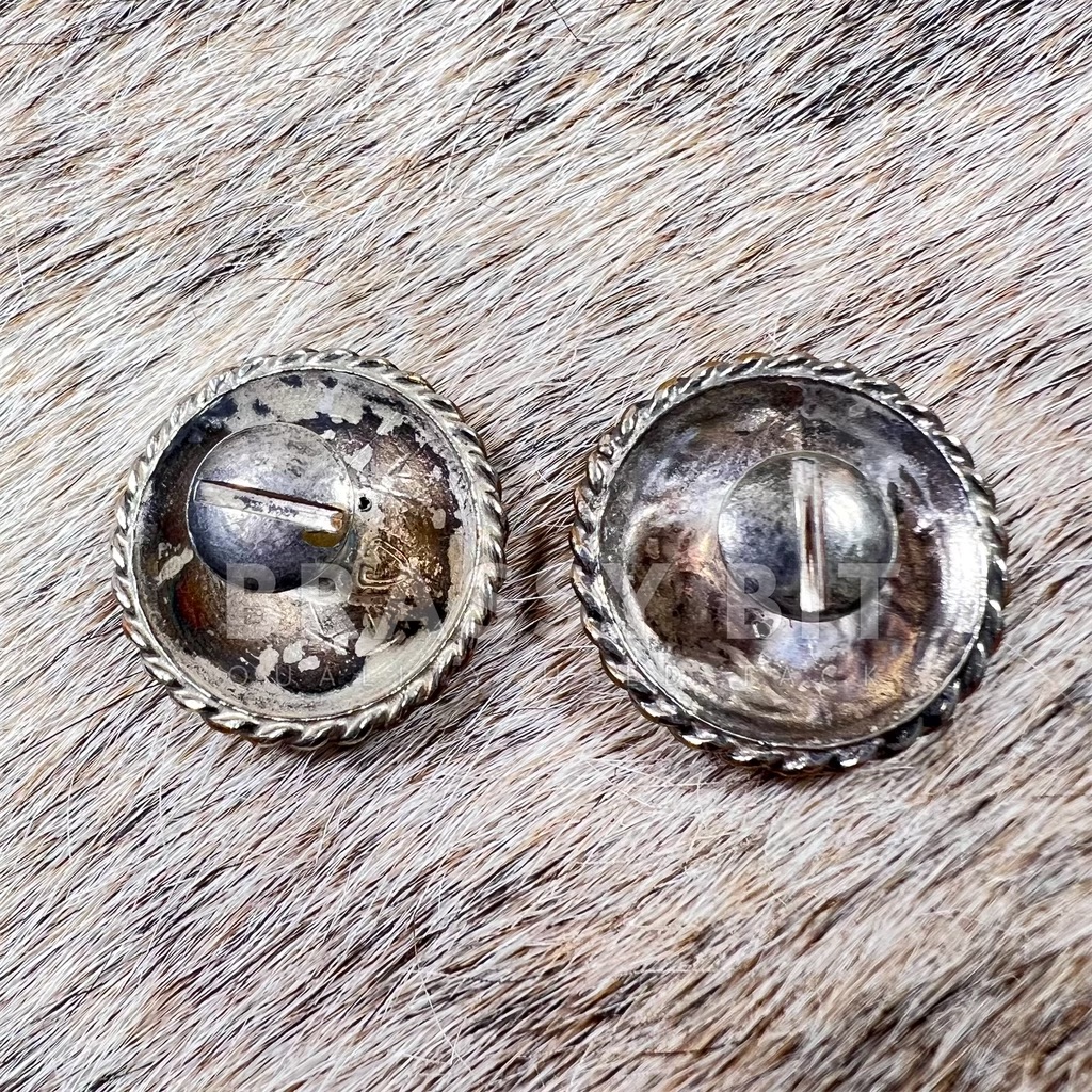 This is an INCREDIBLE vintage concho pair that could be used in a variety of different ways. These would look amazing on a show halter or headstall! While these are not branded, the larger conchos are marked Silver (Sterling) Plated. Comes as a pair. Nice, larger size conchos at 1″, each have incredible silver work with jewelers bronze (gold tone) overlay with inlayed pinkish red stone. These are in excellent/vintage condition showing age appropriate tarnish but no significant wear at all. Chicago screw backs, coming with screws. These came off of a Victor’s tack set, but again these are not branded.