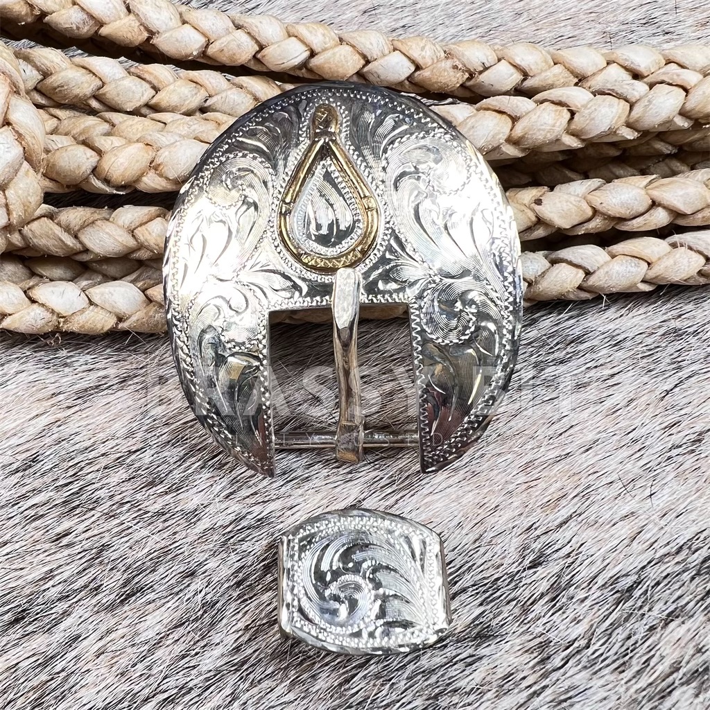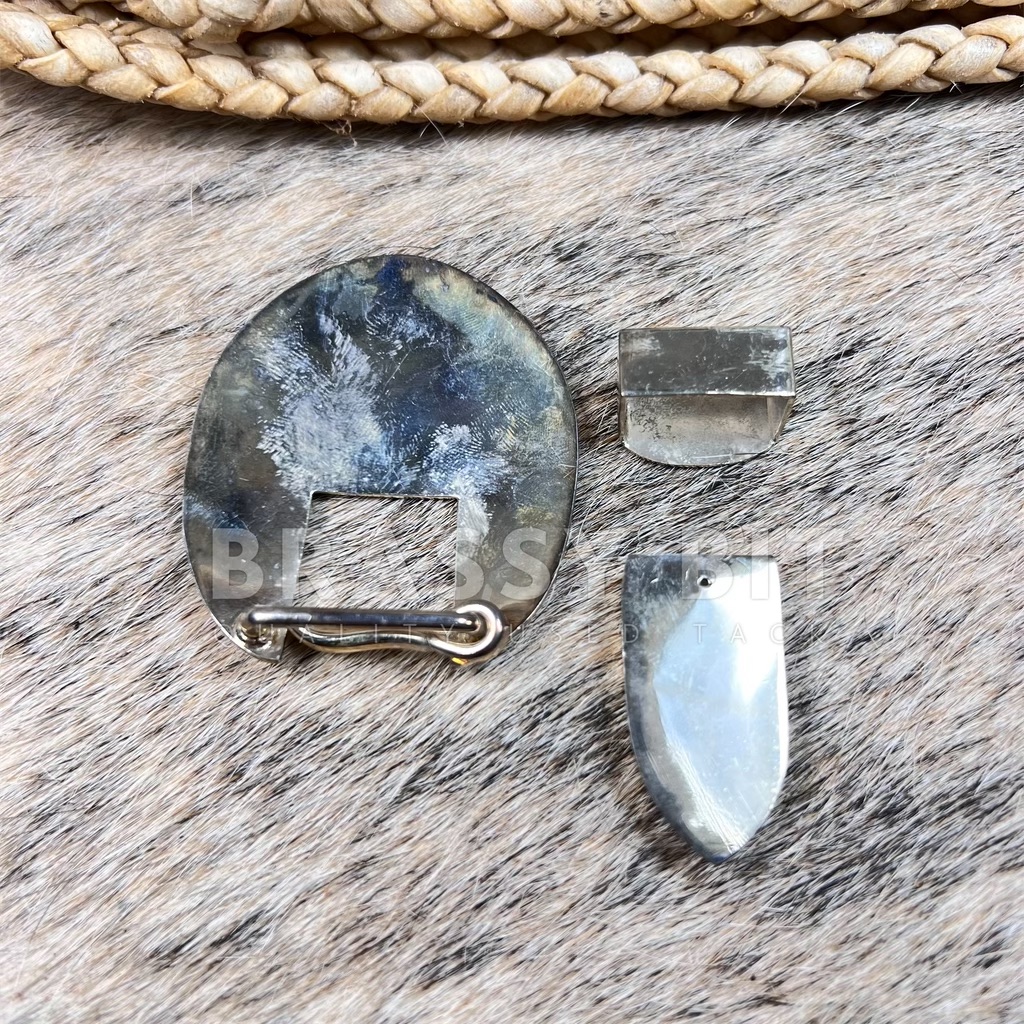 This 3pc buckle set would look amazing on just about everything. Halters, chaps, lunge lines, and more! This is a new without tags/new old stock buckle set, clearly a quality set. This buckle set is not marked, however we’ve got a handful in a the same time, exactly the same that were marked Silver Plated. We have no doubt that they are. Great engraving work lots of detail and is a nice size. Has a Bosal on the buckle in jewelers bronze (gold tone). Comes with buckle, keeper, and tip. Tip is longer than most. New, never used but may show a bit of patina/tarnish from time and storage. Measurements: 2 3/8” long by 2 1/8” long, will fit a strap up to 7/8” wide.