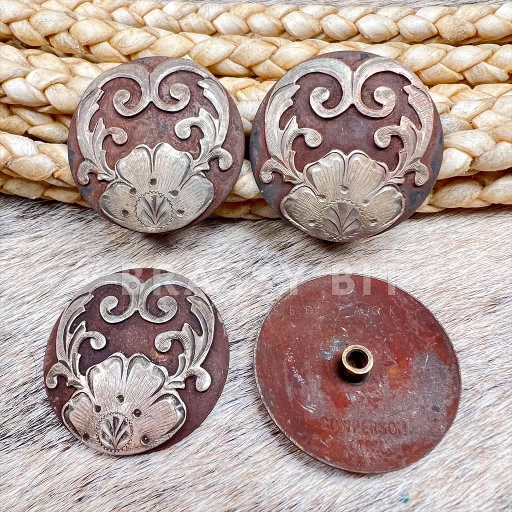 These are so unique and so pretty! From Cowperson Tack and were custom ordered, not available from any CPT dealer, only upon custom order. Each are marked CPT. Each are silver plated over iron, which gives these conchos a really unique, high contrast look. Comes as a set of 4 conchos, each screw back and are 1 1/2″. Slightly domed with engraved floral and vine detailing. These conchos are screw back, working for either a Chicago screw back or saddle screw post, meaning these could be used on saddles or tack. While used, in very good used condition. Showing minor tarnish and a bit of rust on the iron, with one concho showing a bit more rust than the others. This is such a sharp set, one you won’t see on other saddles and tack!