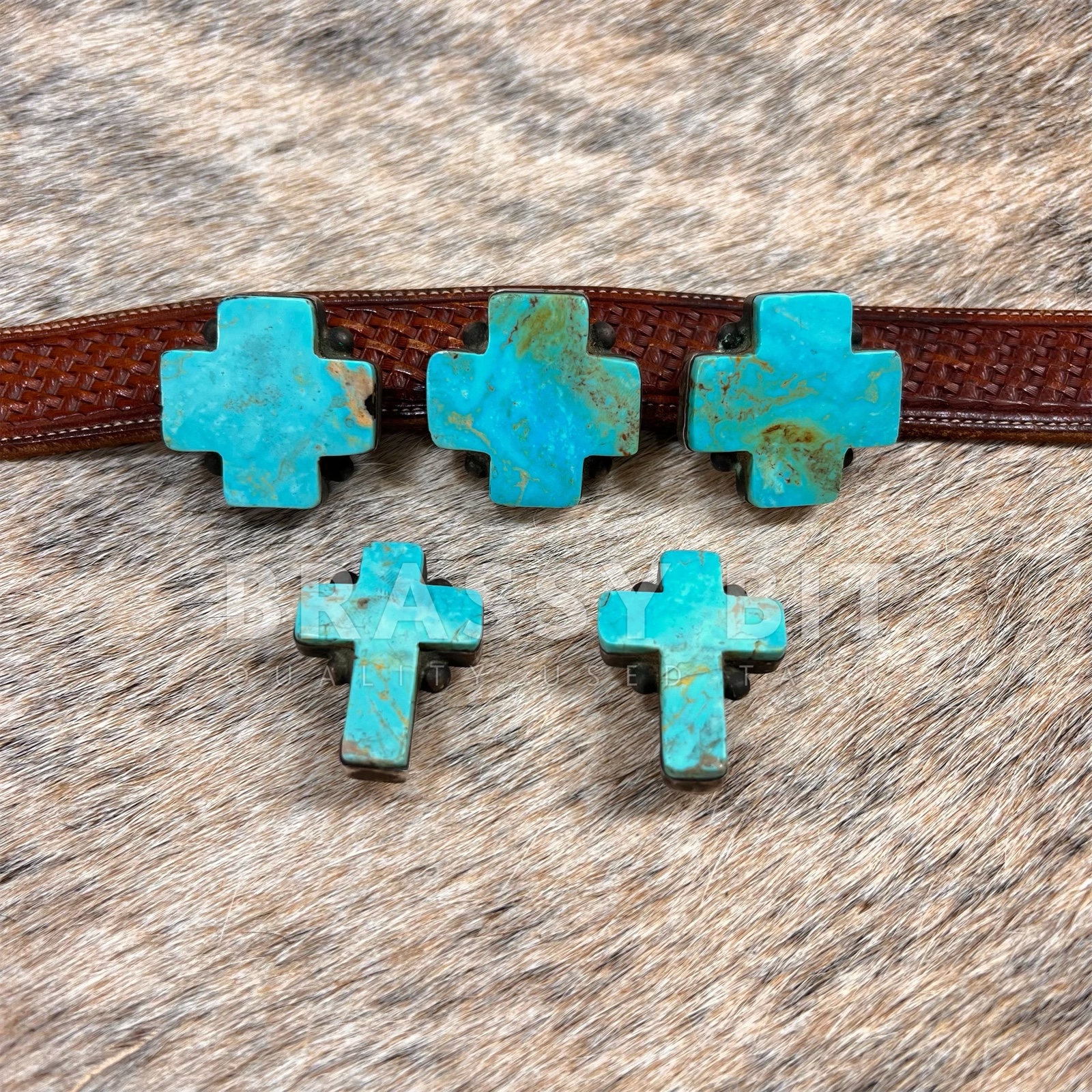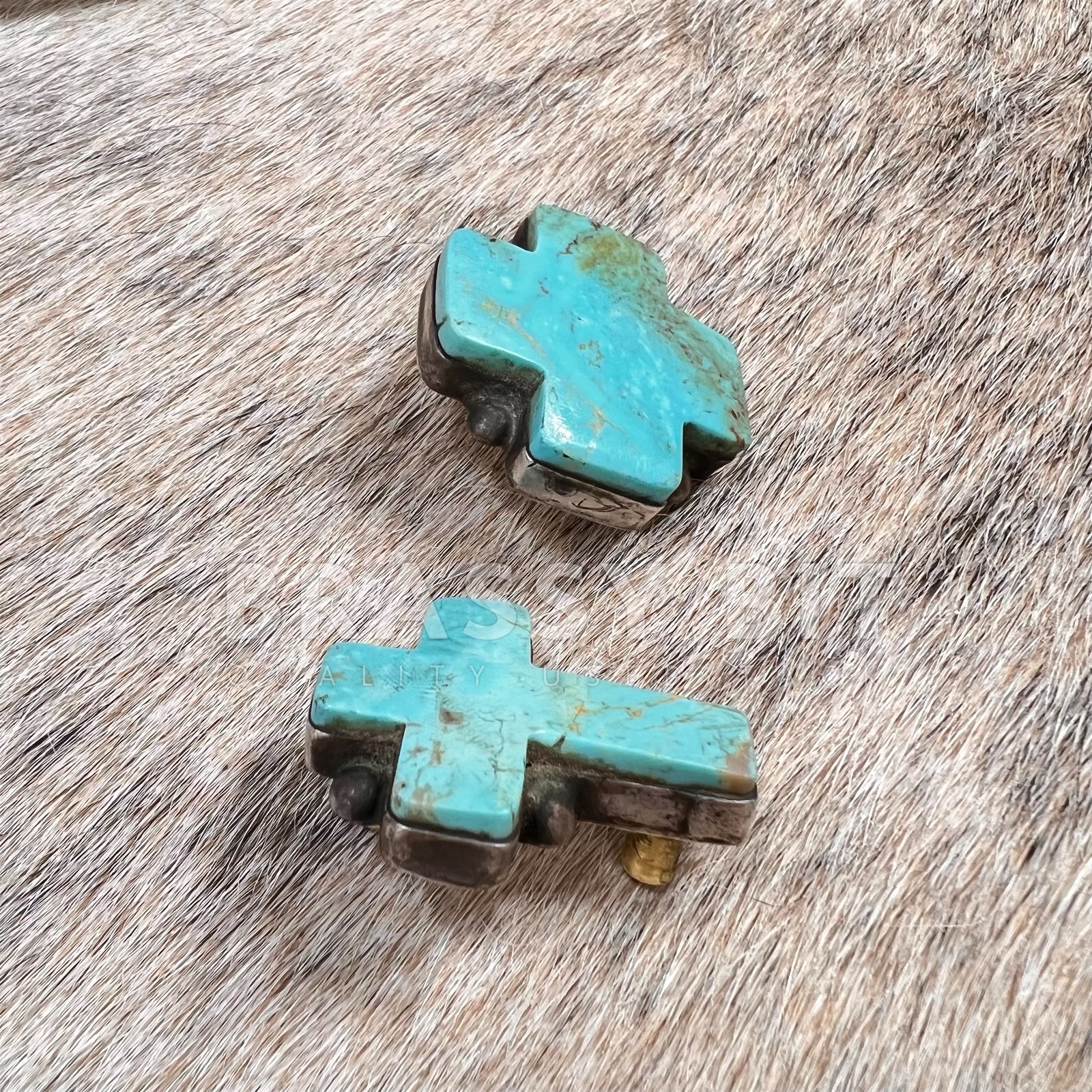 This concho set is just incredible, one of those pieces that is so unique, its likely you (and us) will never see them again. Special ordered from the incredible jewelry-maker and silversmith, Gale Self of the OK Choctaw nation. Signed on the back (Gale Self) and marked sterling, with quite a bit of sterling silver weight, finished off with a large jewelry grade turquoise piece. Comes as a set of 5, 2 narrower crosses and 3 wider crossed. Concho/Chicago screw backs, each with two posts to safely secure these beauties to your set. Designed to work with a concho belt or horse tack/equipment. Please note that our lighting makes the turquoise look a bit more blue, it is slightly paler than the photos show. Thicker cross measures 1.5″ x 1.5″, narrower cross measures 1.25″ x 1.5″. These are in excellent used condition, silver does show patina.