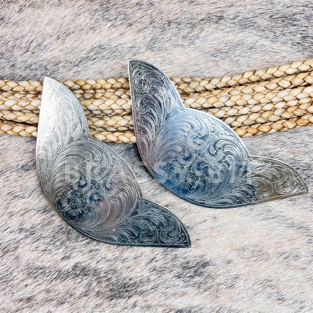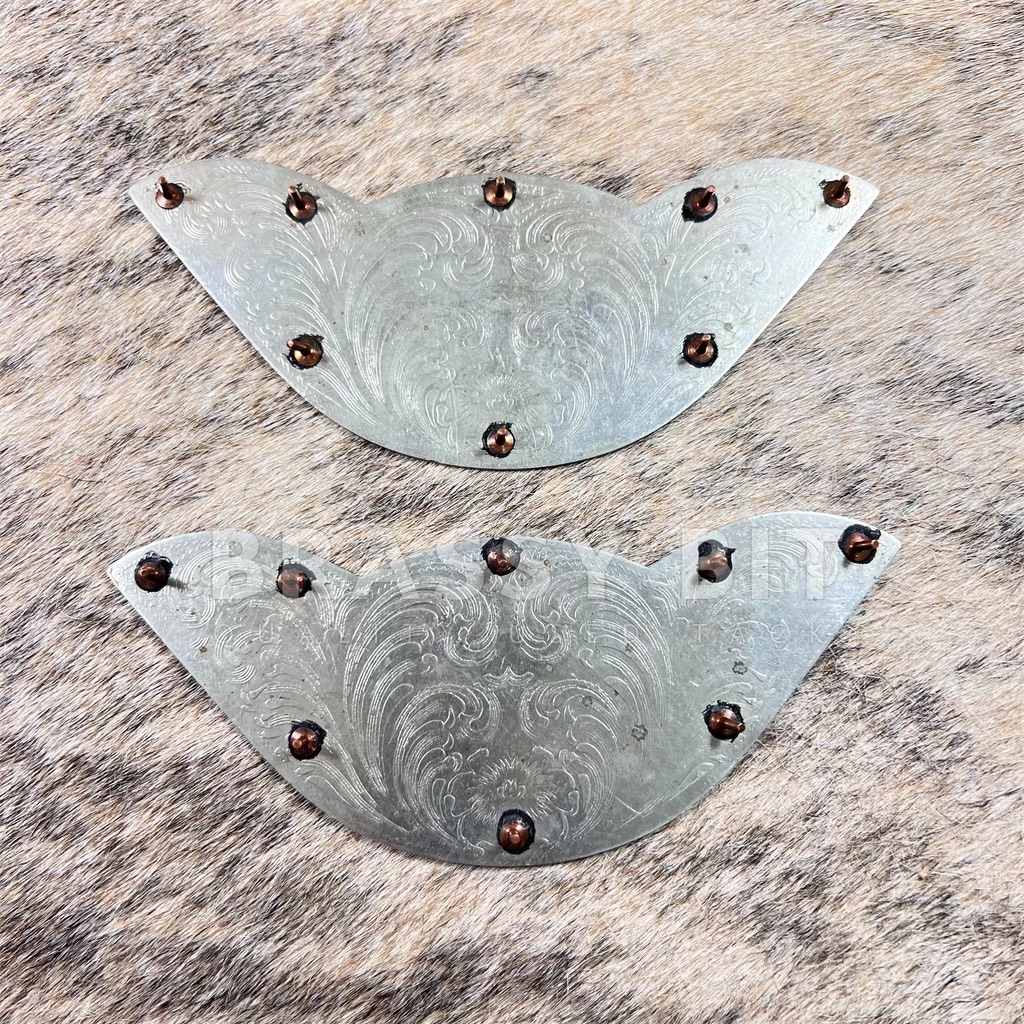 These are really nice, larger silver plates for your saddle. Marked German Silver, full of great engraving work and have a great, classic look. These are new old stock, never used just stored. May show a bit of tarnish due to storage. These are rivet set, with rivet posts fixed to the back. Not a cheap looking set here! Comes as a pair. Measurements: 7 1/4″ long by 2 7/8″ wide.