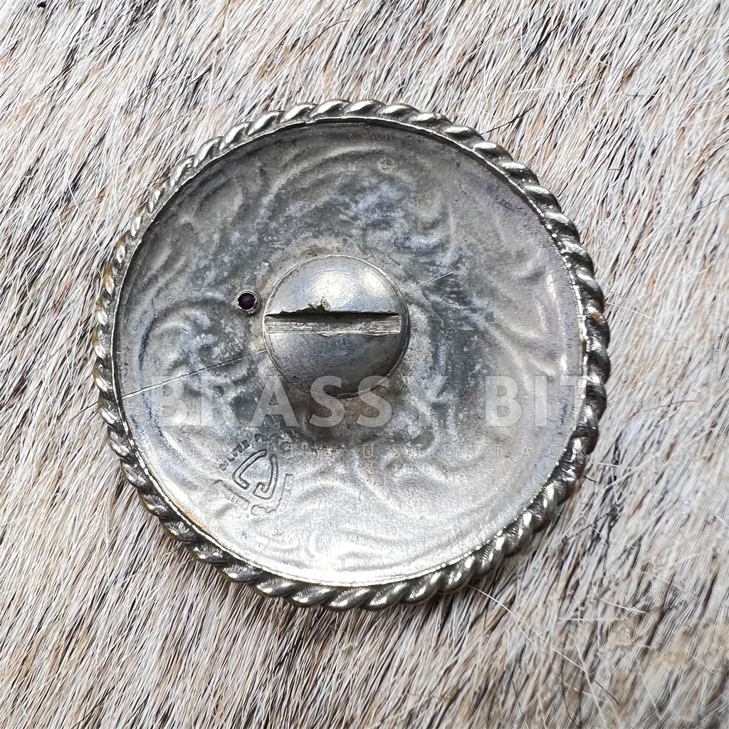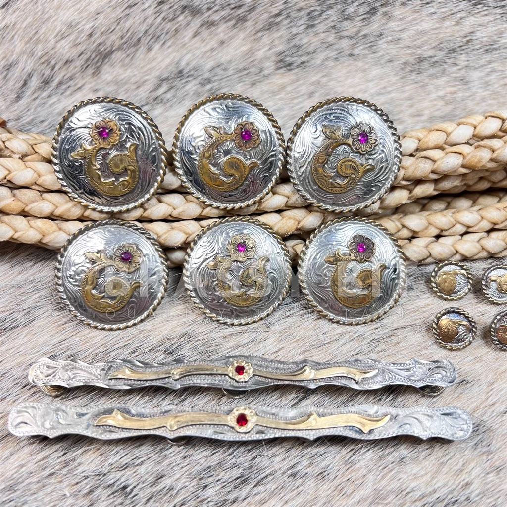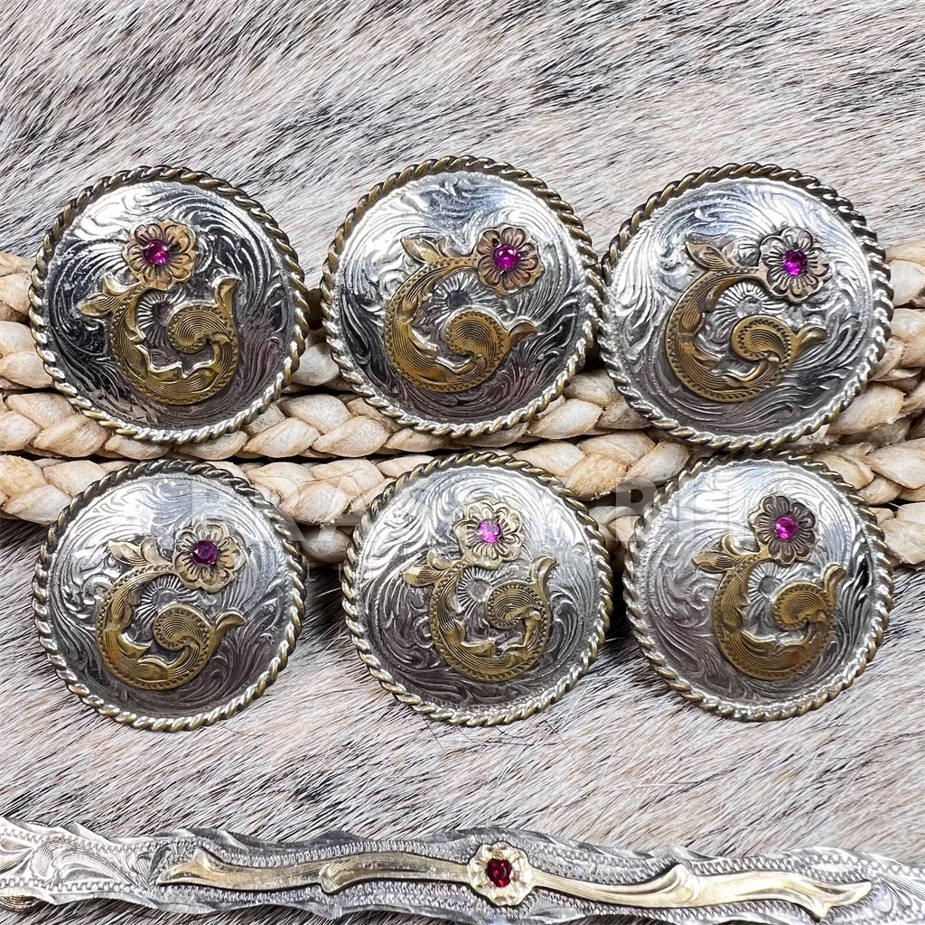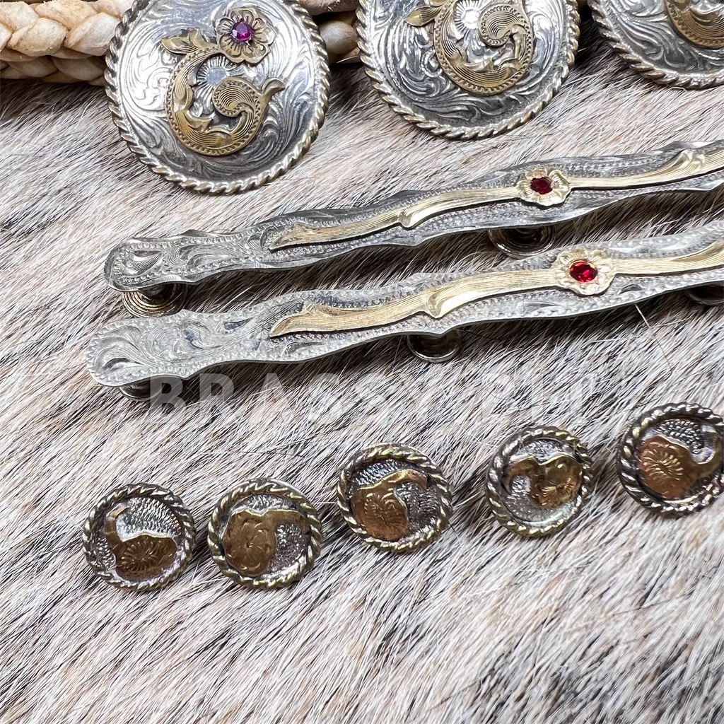 This is an INCREDIBLE vintage concho set that could be used in a variety of different ways. These would look amazing on a show halter or headstall! While these are not branded, the larger conchos are marked Silver Plated. Comes as a 16 pc set. Larger conchos have incredible silver work with jewelers bronze (gold tone) overlay with inlayed pinkish red stone. The long plates have the same bronze and have a more red inlayed stone, and finally the small conchos have the same detailing. All are in excellent/vintage condition showing age appropriate tarnish but no significant wear at all. All are Chicago screw backs, coming with screws for the large conchos and plates. These came off of a Victor’s tack set, but again these are not branded. We are not interested in separating this bundle at this time.