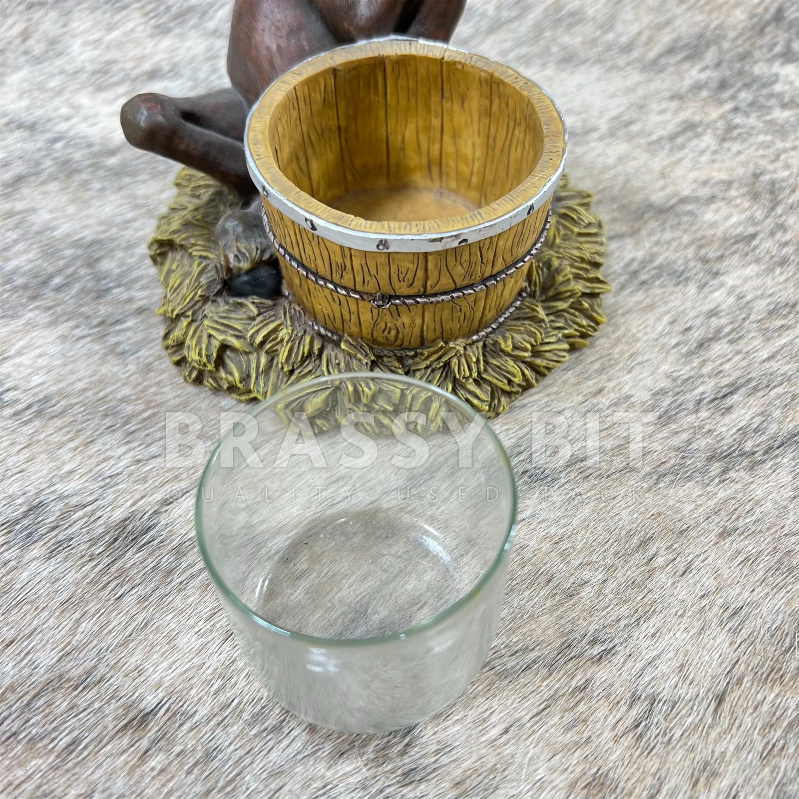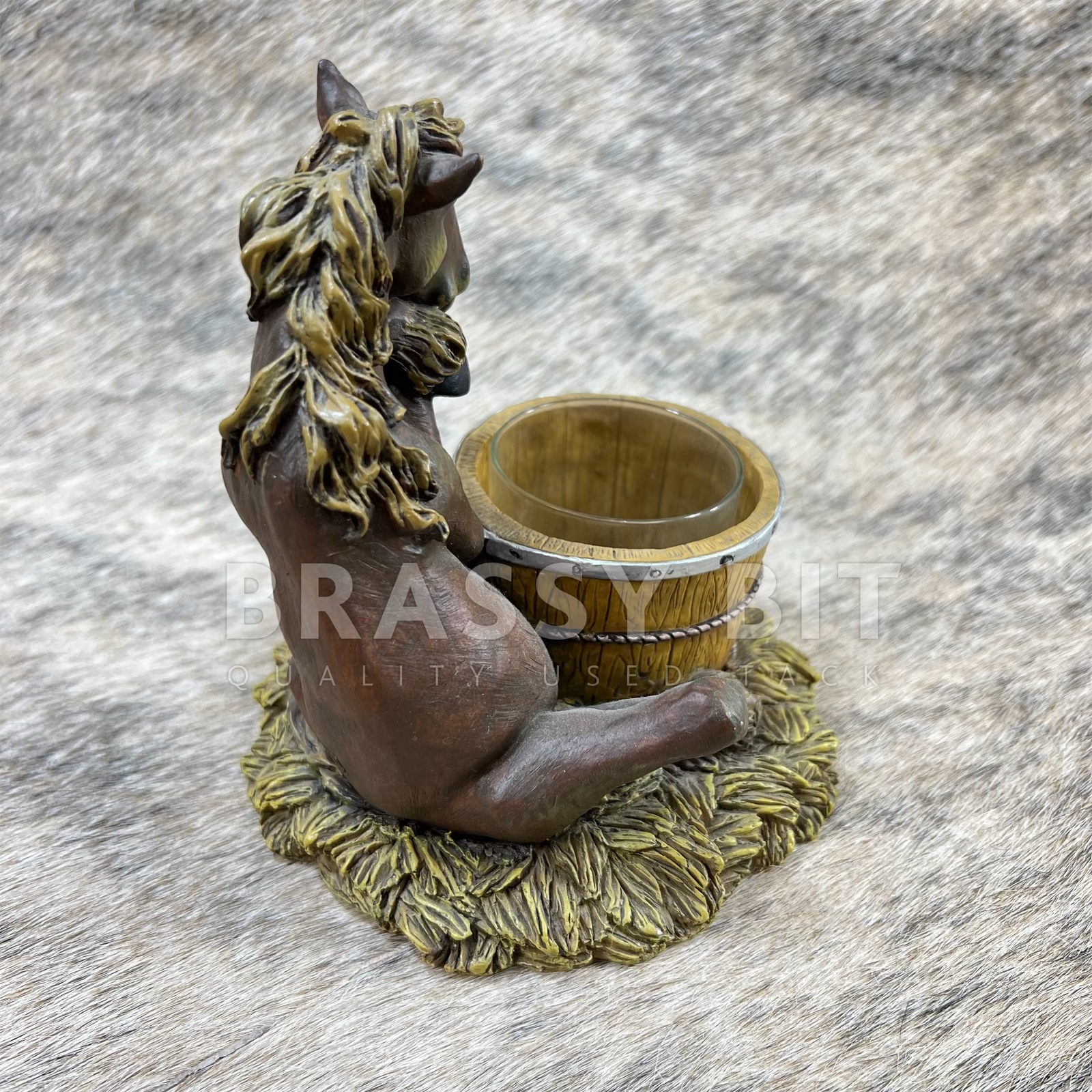 Here is an absolutely darling, medium size Original Montana Silversmith Elmer from the popular Elmer Pasture Pals collectible figurine collection. This is one is from one of the first years of the Elmer collection, great for collectors or add to your decor. This Elmer horse is sitting on a pile of straw, next to a barrel that is a candle holder. Has a glass cantle holder. This one is a new/old stock item, but was used in a small shop as one of the displays, so has a teeny bit of dust in the cracks. Numbered 0102/#9236 on the underside. So cute! Rough measurement: 5.75″ tall x 5″ wide x 5.5″ long.