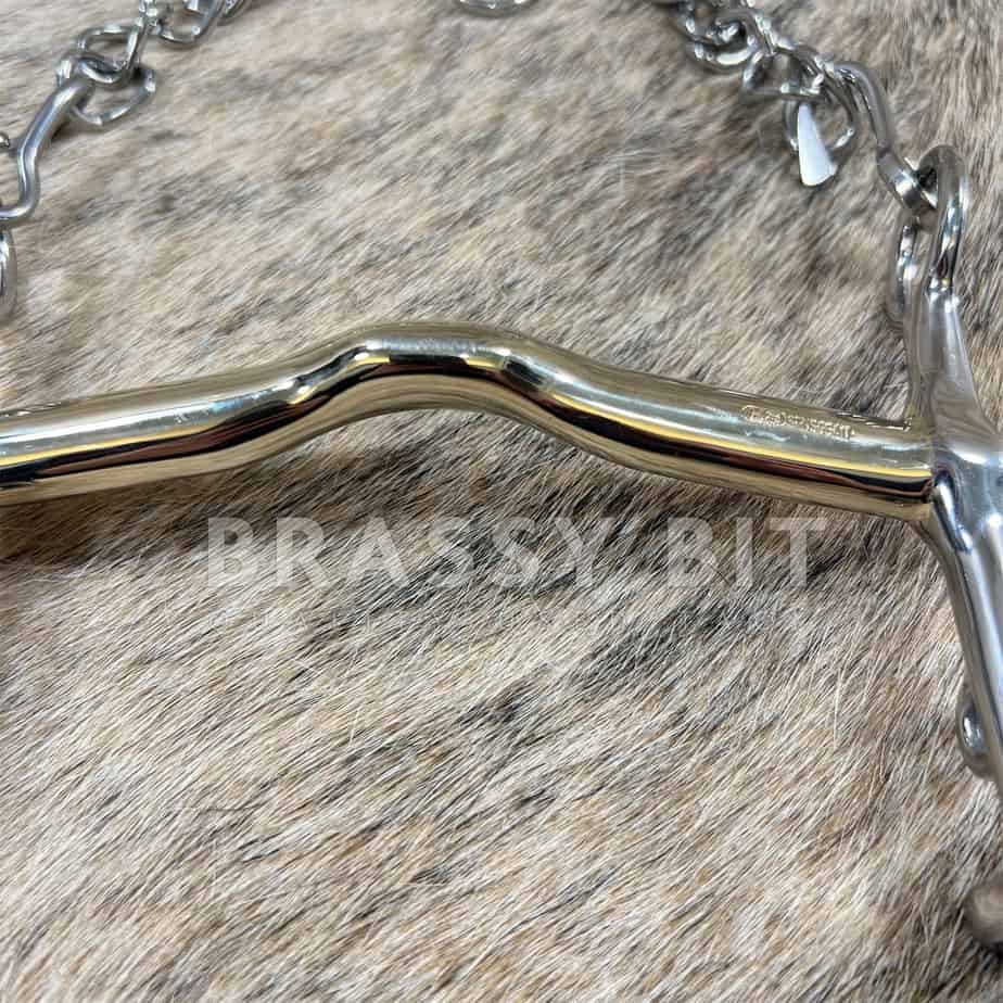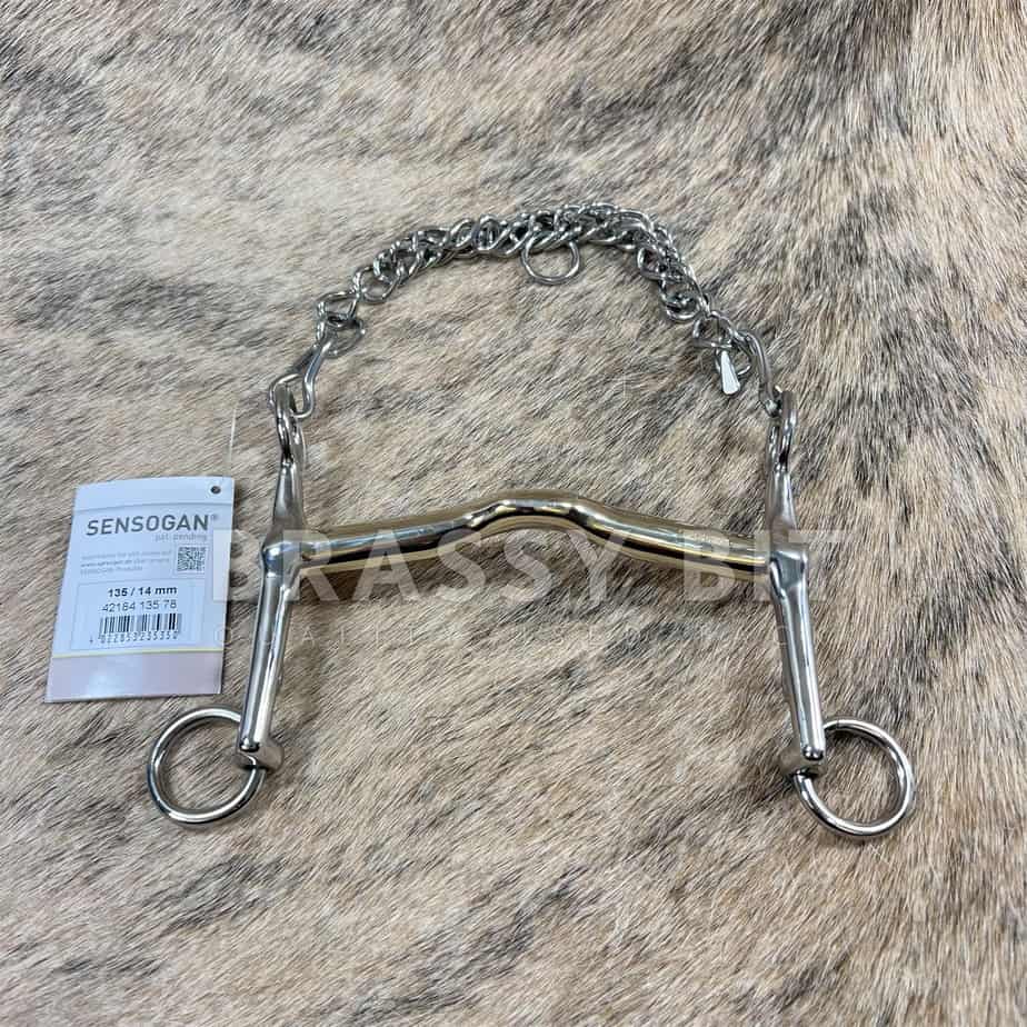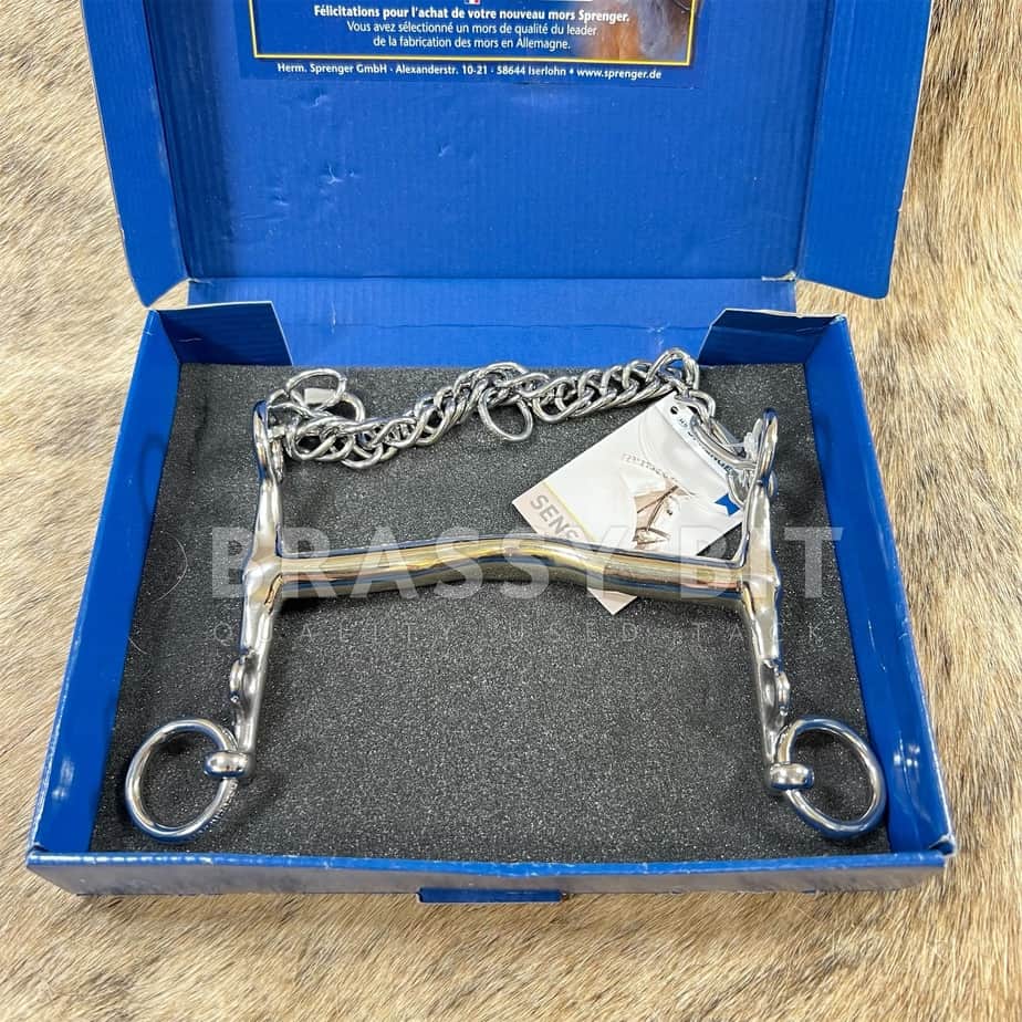 5.25″ New with tags (actually, new in box!) Herm Sprenger Sensogan NovoContact Weymouth English Curb. Thinner 14mm mouth, with shorter shank, and low/wide/shallow port mullen mouth. This one is new with tags, box and tags do show some wear from storage, but at the point we are being picky. This bit is offered WAY lower than retail! Comes with curb chain. Per the maker: