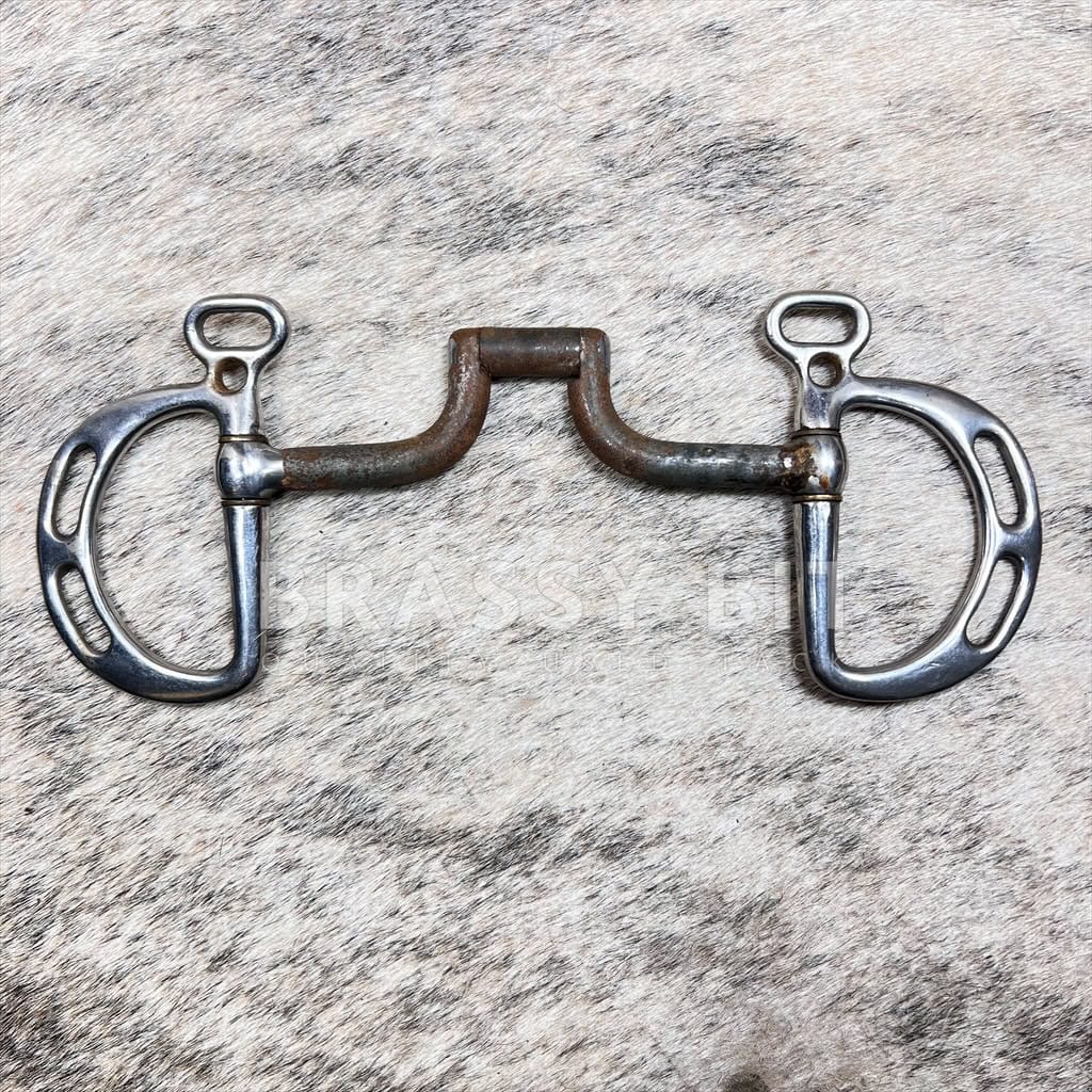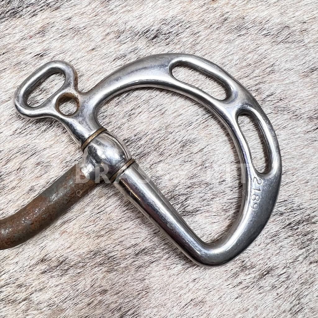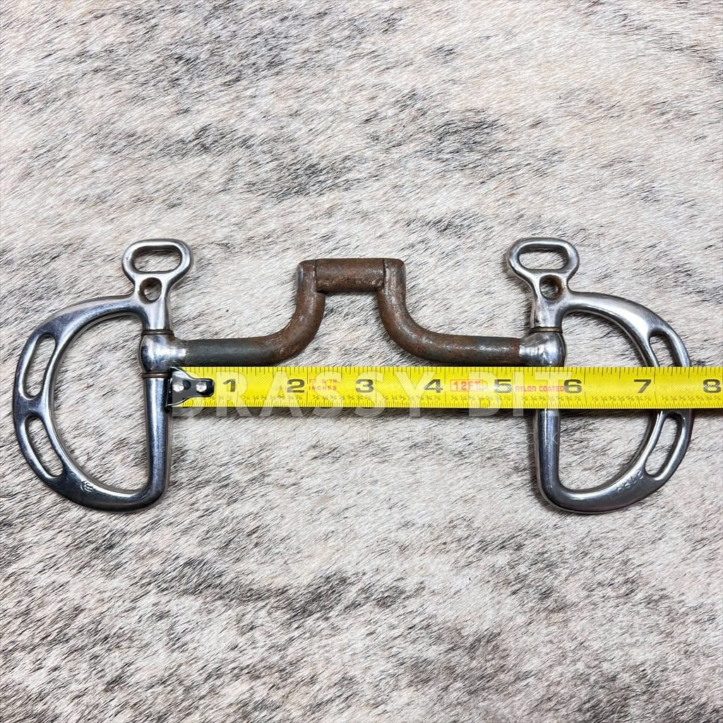 Here is a nice used English bit from Reinsman (#2189). This 5.25″ Kimberwick is a copy of a western correction bit, with slightly thinner diameter mouth that is all sweet iron. The mouth is a fixed mouth, sloping up to a correction port. The bit only rotates at the cheeks, the mouth/port is fully fixed. Nice, slightly larger mouth at 5.25″, port measures 1.75″. This is a great option for a finished horse who wants more stability for their bit, while still wanting something similar to their western bit. The slots on the cheeks allow for varying leverage options. This is a hard to find bit! In very good used condition, showing minor rust from time and use. Nice correction bit!