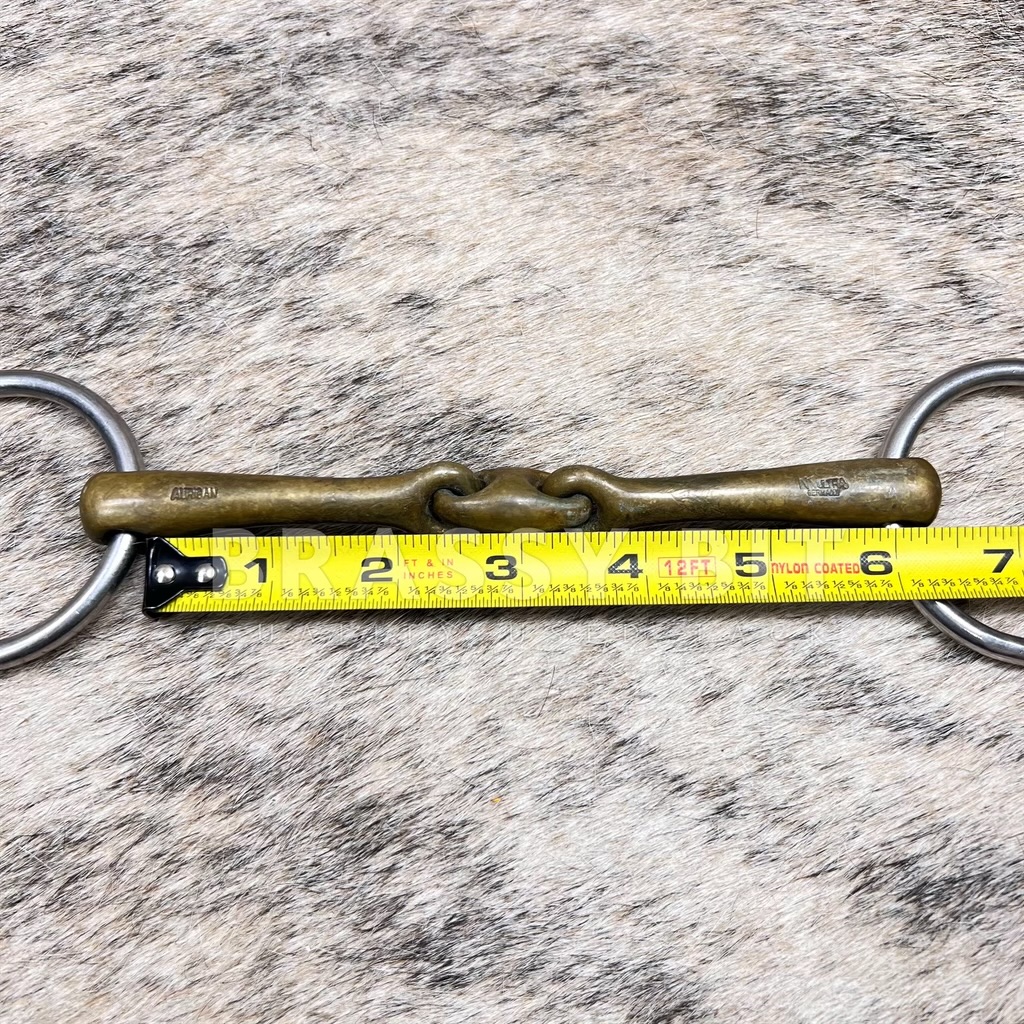 5.75″ lightly used Herm Sprenger KK Ultra 12mm Bradoon snaffle. Lovely bit, one of our personal favorites. This one is narrower diameter, either 12mm or 14mm, 55mm (2 5/8″) rings. Remember, HS bits are measuring hole to hole, not ring to ring. In Aurigan, in very used condition showing just a few very minor teeth marks. Per the maker: