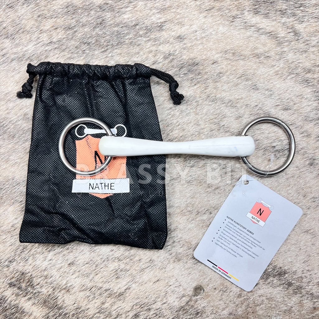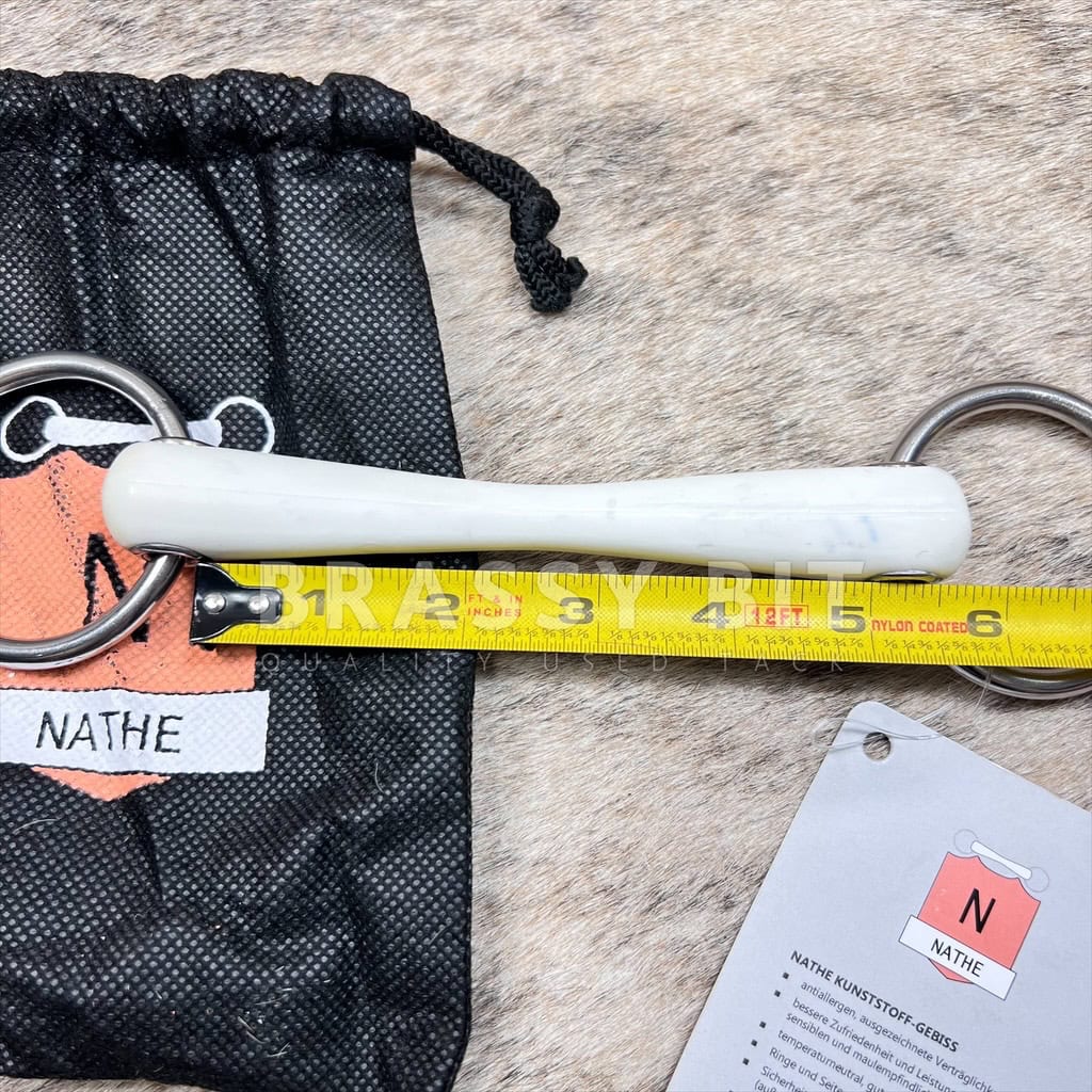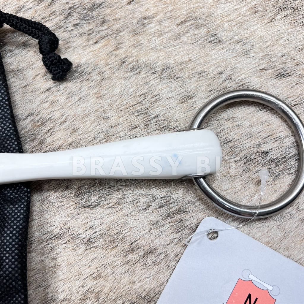 These bits are so popular for training, for horses who don’t care for metal materials in their mouths, or who need a very kind bit. Marked with an “N” at the cheek, this is a newer style with the brilliant pinchless rings. 5″ mouth, 20mm diameter, slightly smaller ring style (2 1/2″) with a bit of tapering in the center over the tongue. New with tags and in bag! Shows a couple minor marks on the mouth from storage.These are one of our favorite bits!