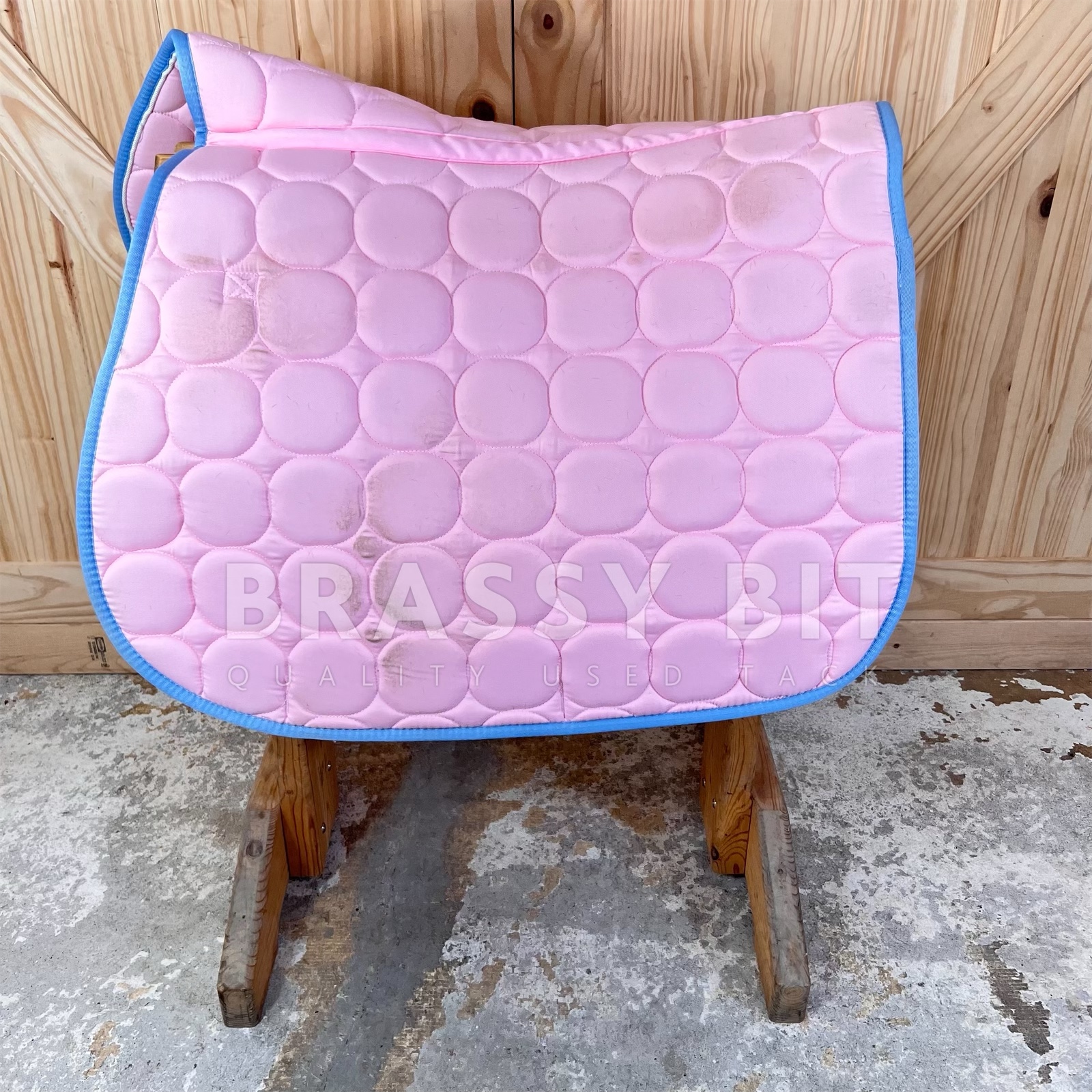 How darn cute is this pad! In a pale, baby pink with white and blue piping. Heavily quilted with Velcro tabs and billet keepers. This pad is a cross between an All Purpose and Close Contact pad, with ample room at the front of the pad for a forward flap. Full Size: 23” spine, 20” Drop. This pad is a New with Tags/New old stock pad. However, has been used on a saddle fitting and has a few dust marks from storage. Hardly used at all.