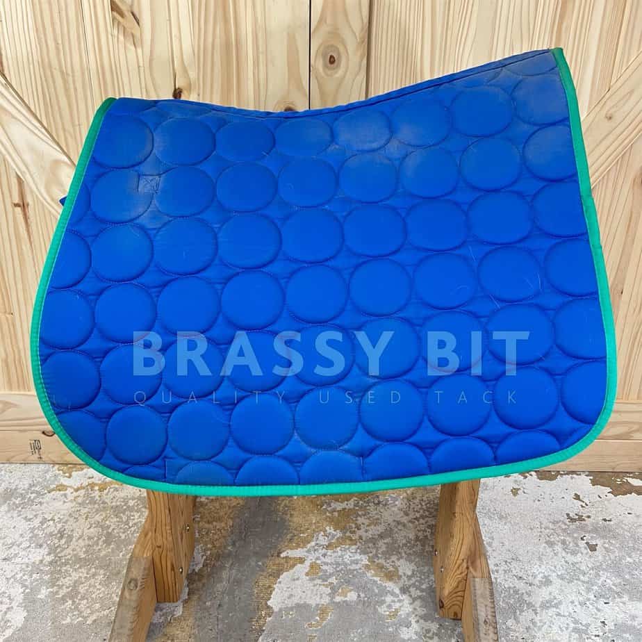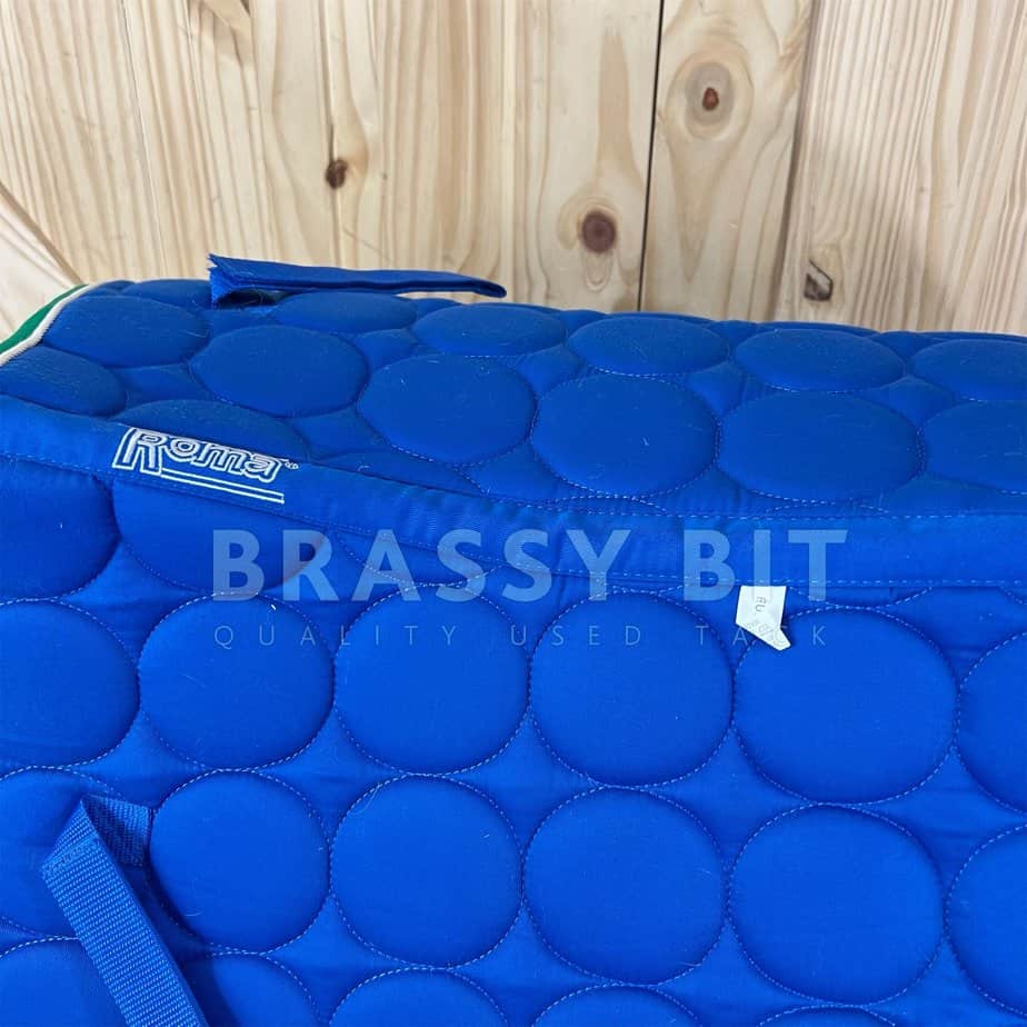 Here is a lovely, great colored English saddle pad from Roma. Bright blue with green and white piping. This one is new without tags, never used, but has been in storage. May show a horsehair or two from storage. Full/Standard size with velcro tabs. 22.5″ spine, 20″ drop.