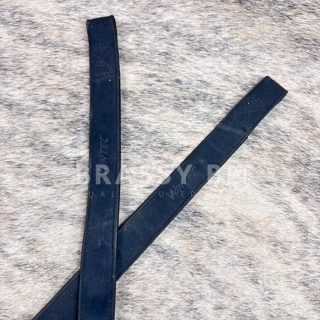 So many of our English riders love Webbers, as they reduce bulk under the leg, limit friction on the saddle to lessen blemishes, and are very easy to adjust. These Webbers from Wintec are in Equi-Suede, which is a synthetic material–the same material used on models such as the Isabel, that have all the feel of leather but without the maintenance. This pair is very lightly used, excellent condition. Adjustable from 19″-24″. In black. Does not come with the buckle cover/sleeve.