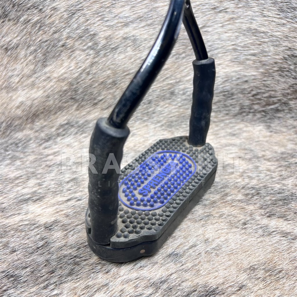 These 4.5″ Bow Balance Irons from Herm Sprenger are in all black, which was a limited production color option. We love the all black look of these irons. These are incredibly popular among riders who need a bit more flexibility to their irons to support lower joint comfort. These irons are in excellent used condition, showing less than normal signs of use. One iron has a bit of rubbing on the rubber/flex sides but very minor and only cosmetic. Per Herm Sprenger: