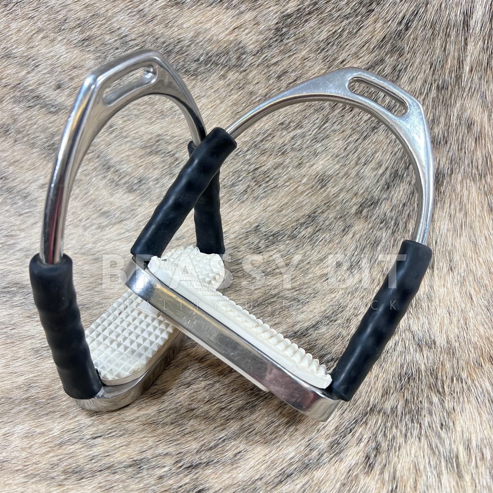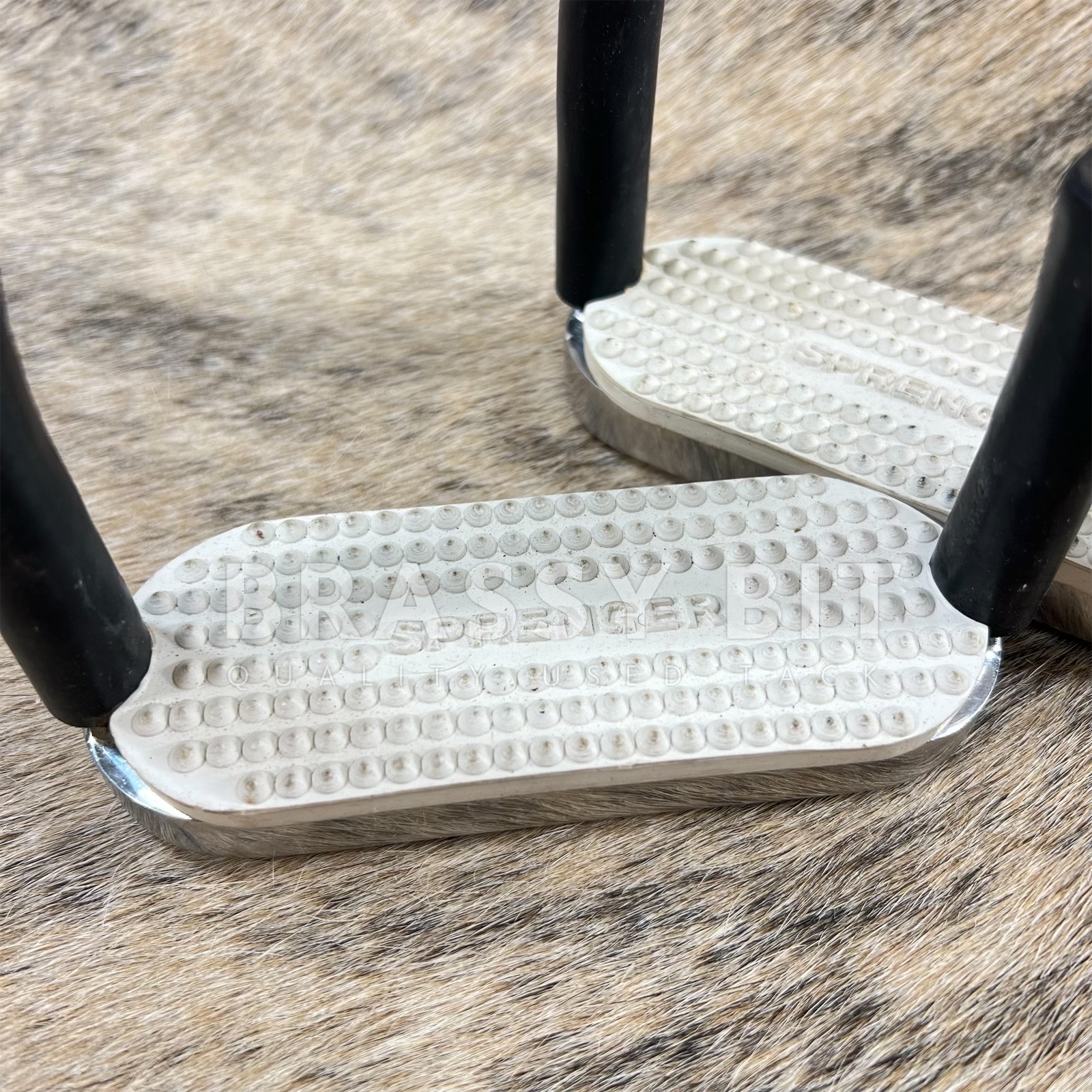 These 4.25″ Herm Sprenger flex Stirrup irons are a great option for a rider who need a bit more flexibility to their irons to support lower joint comfort. These irons look like they’ve hardly been used, with hardly any dirt on the white pads. These have a nice weight to them, in hardly used condition, offering flex at the side joints. There is no wonder why these irons are so darn popular!