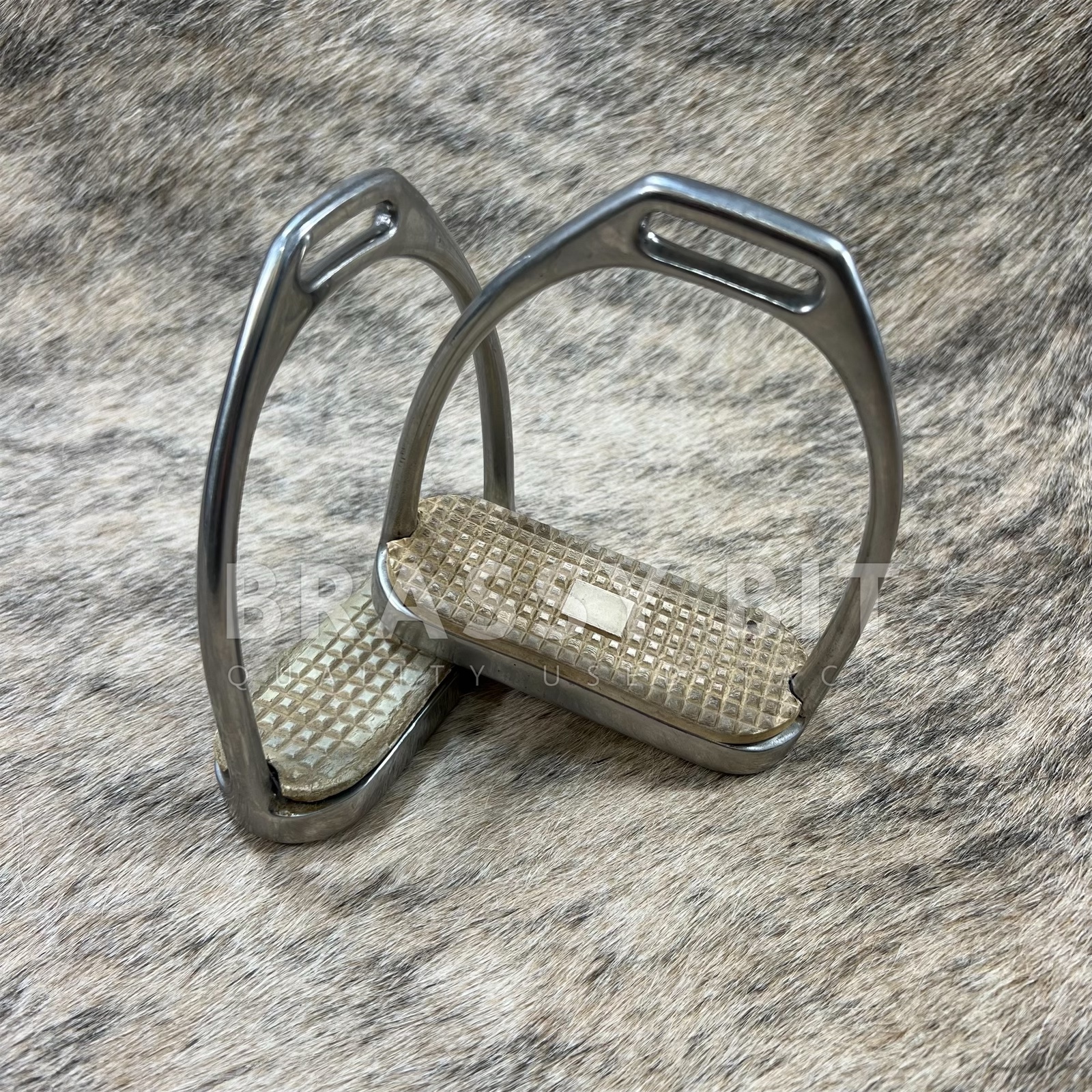 Here is a nice pair of wider and heavier English stirrup irons. In good used condition, these are winter boot friendly at 4.5″ and have weight to them. Weighted irons are popular as they help stabilize the lower leg and you have to spend way less time digging for your stirrups if they have some weight. White rubber pads. Irons are in good used condition, with only the pads showing some use. Nothing fancy, but good condition and quality.