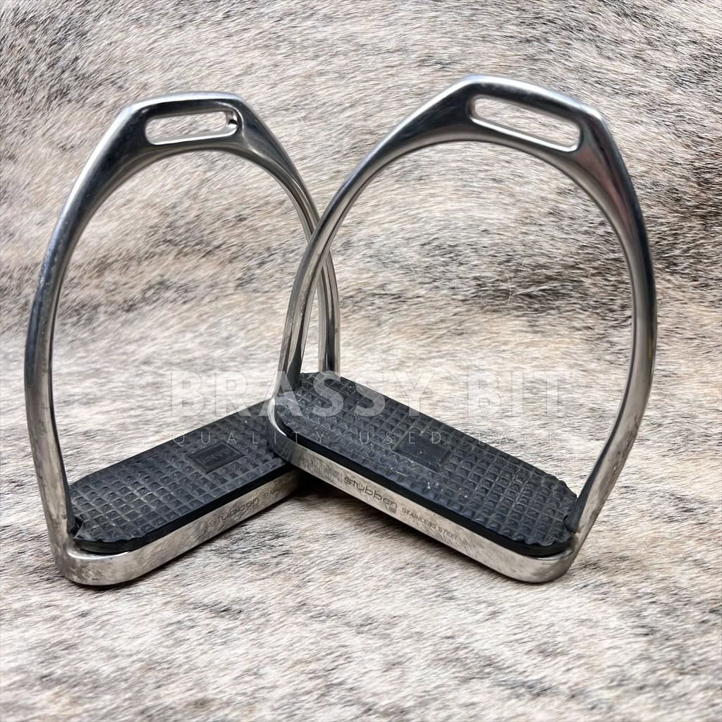 Here is a nice, safe set of English Irons. Made by Stubben and are in very good used condition. Stainless, have rubber foot grips, measure 4.75″, making these irons a great option for your winter boots, larger than most stirrups. These are a bit weighted, which are a great option for a rider who desires more stability to their irons and limits the need to dig for your irons. In very good used condition, showing very limited signs of use.