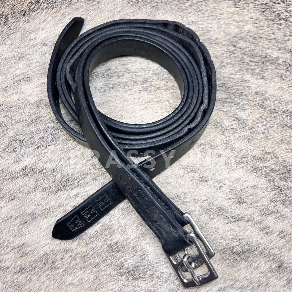 58″ black English stirrup leathers. These black leather are in very good used condition, made from a heavier ounce leather so are heavier duty than most. Are Amish Made, made from heavier duty harness leather that are sure to last. These have been used, but well cared for, leather is quite soft. Have the initials “HMW” stamped with leather stamps at the very end of the leathers, on each one.