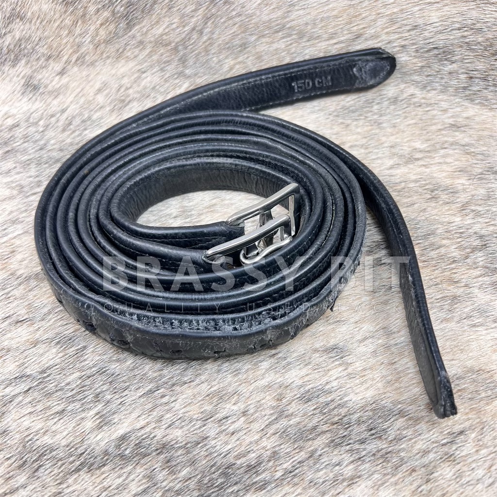 These calf leathers from Passier are heavy! Super soft, pre-stretched calf leather that is like thicker and more durable, but still very soft. These have seen some use, but are ready for more. In black, 60″ and are nylon lined to prevent too much stretching. There is some wear/fraying to the inside of favorite holes, but nothing too crazy and no cracking to the leather. Well cared for, excellent leather quality, and so affordable for a high end piece of tack. Calf is a popular option as it limits rubbing of your leathers on your high end saddle flaps.