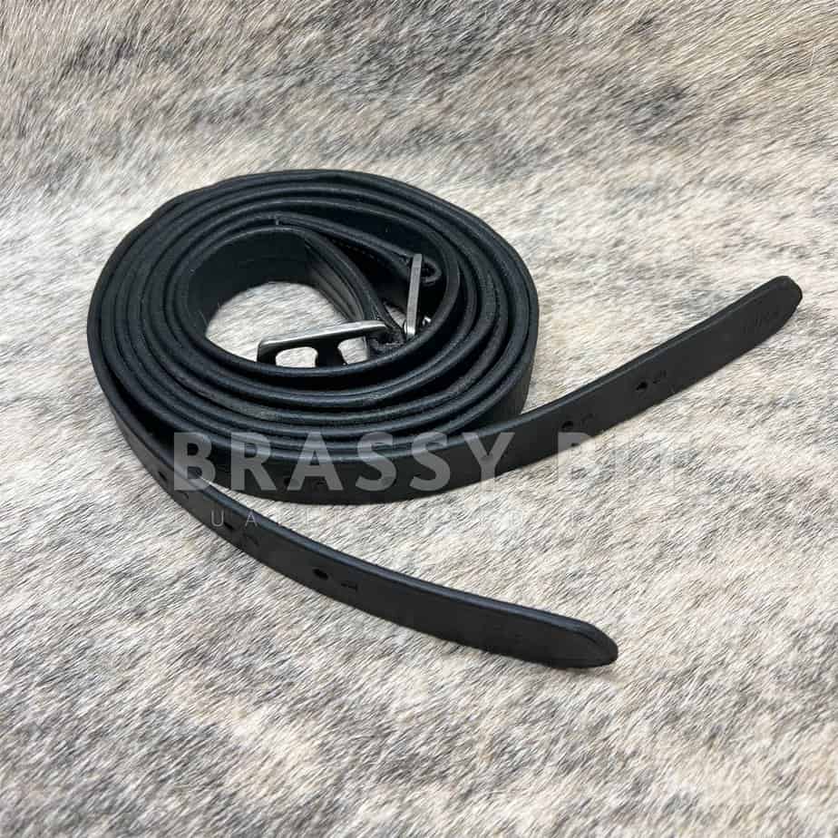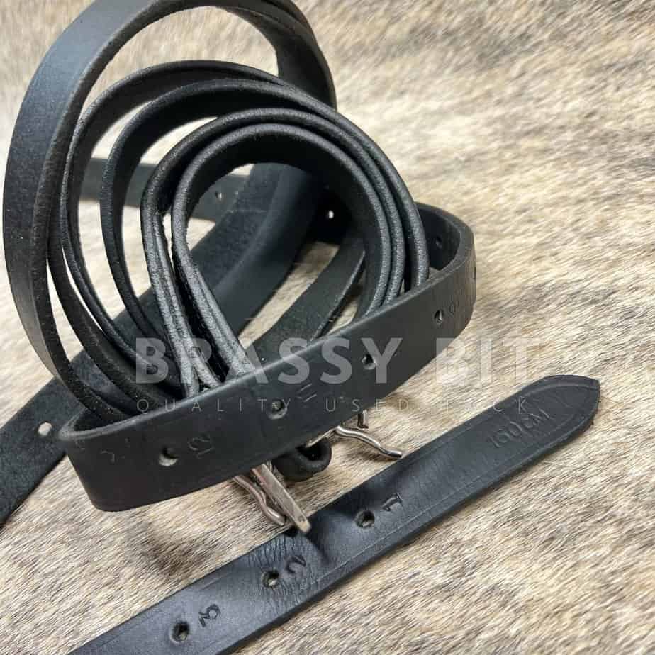 64″ used stirrup leathers in black. Not branded, but are nice leather. Better than economy. In good used condition, showing normal use and wear. Perfect for a tall rider!