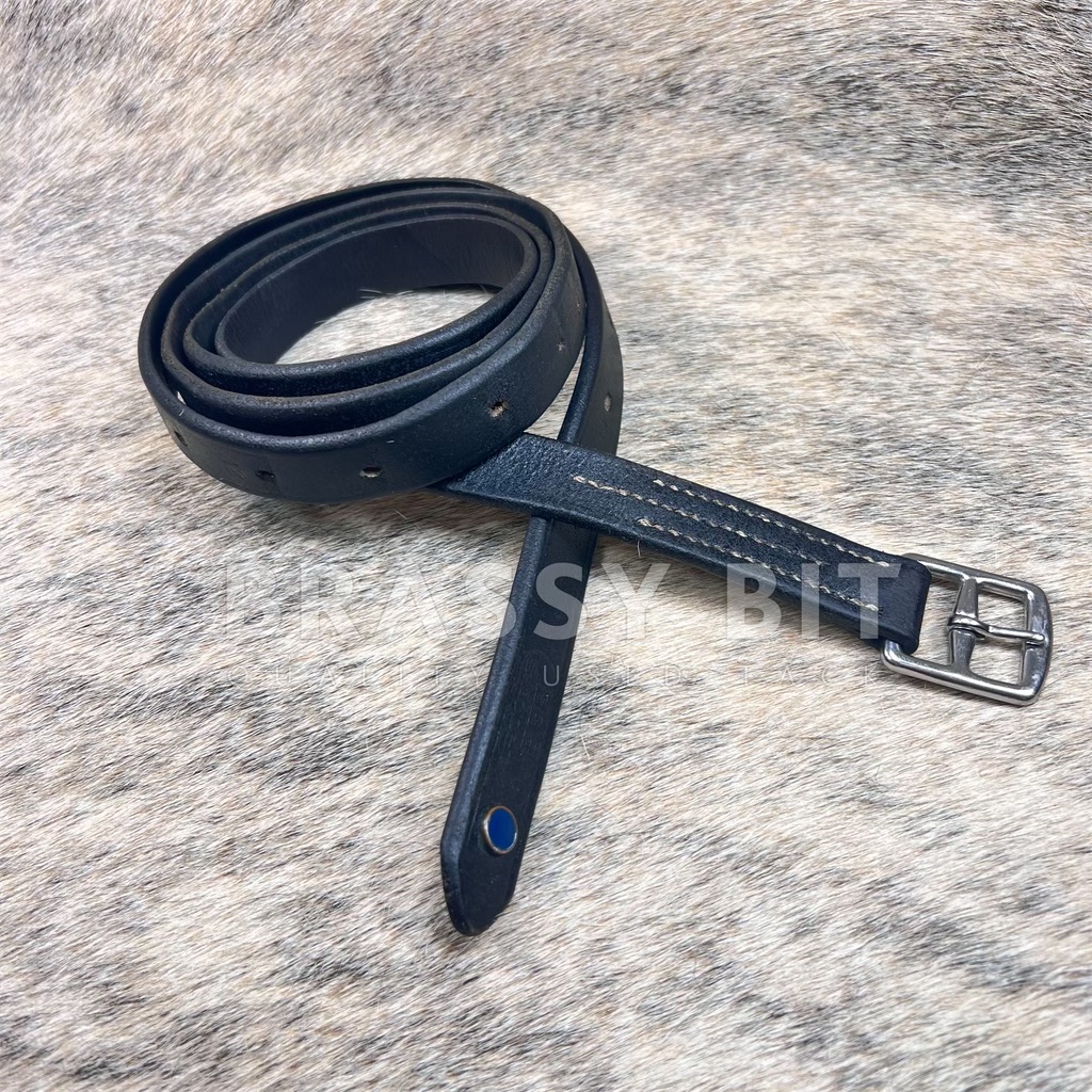 THIS IS A SINGLE STIRRUP LEATHER!!! Sometimes s**t happens and you just need a single stirrup leather. Here it is! Rather than buy a new, expensive pair. Longer leather at 67″, in black leather. Marked Stubben and has Stubben’s blue dot at the end of the leather. Leather is quite soft, has had a couple holes added, does show use but has more life left. Would also be a great neck strap!