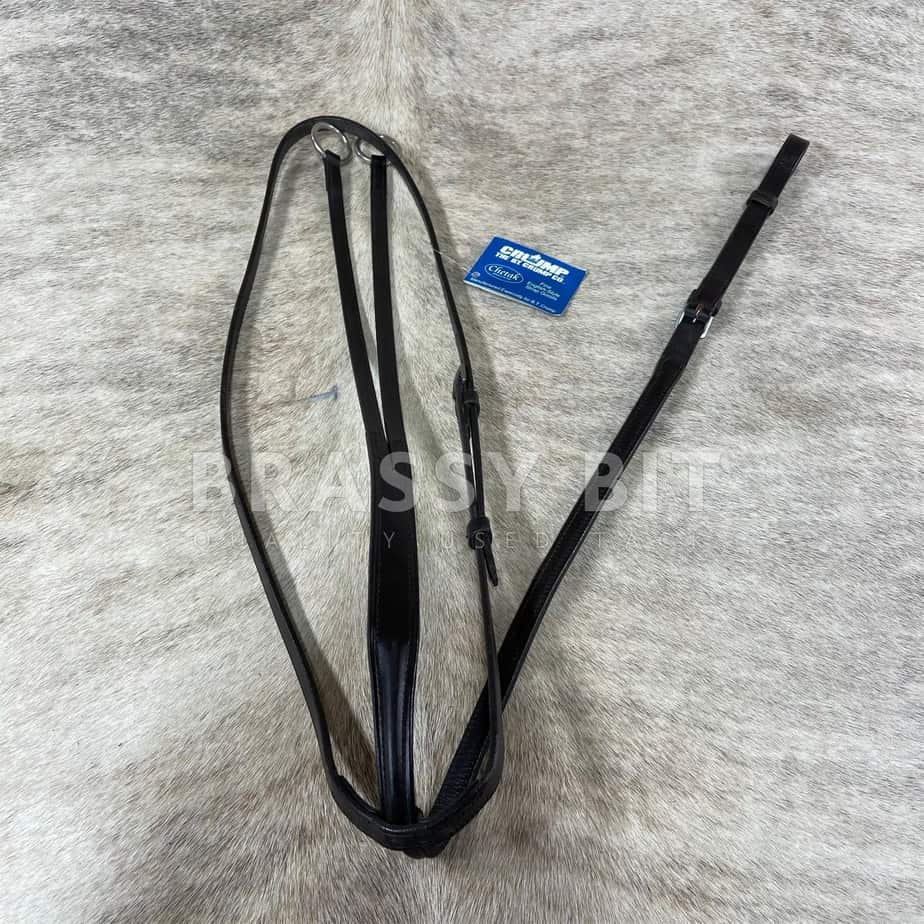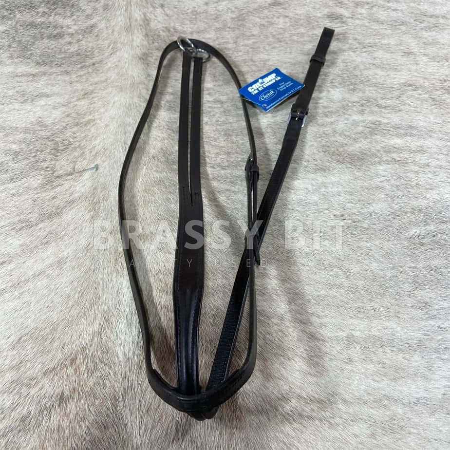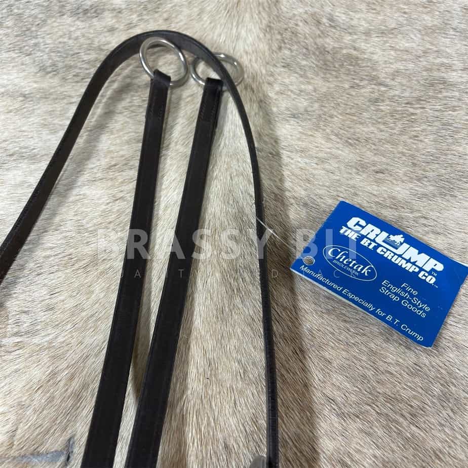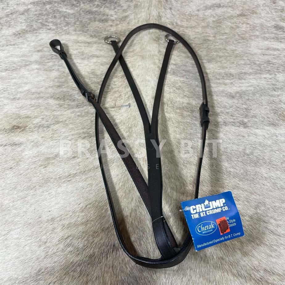 New with tags from BT Crump, from their Chetak economy leather line. Horse/full size, good adjustability, in very dark brown with raised leather. English breastplate with running rings. Nice affordable piece of tack!