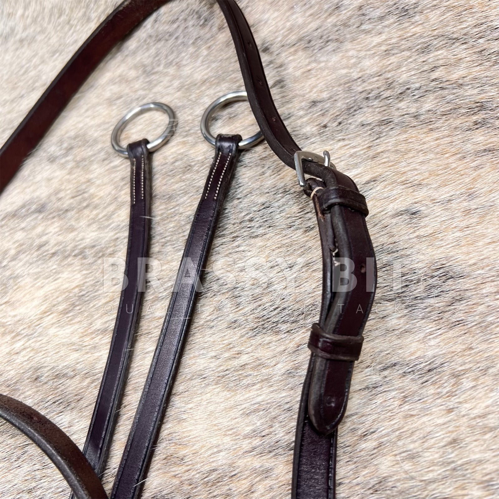 Here is a lovely running martingale from Pessoa. In butter soft, chocolate brown leather that has clearly been well cared for and is in excellent used condition. In cob size offering ample adjustability. In excellent condition, offered way less that retail.