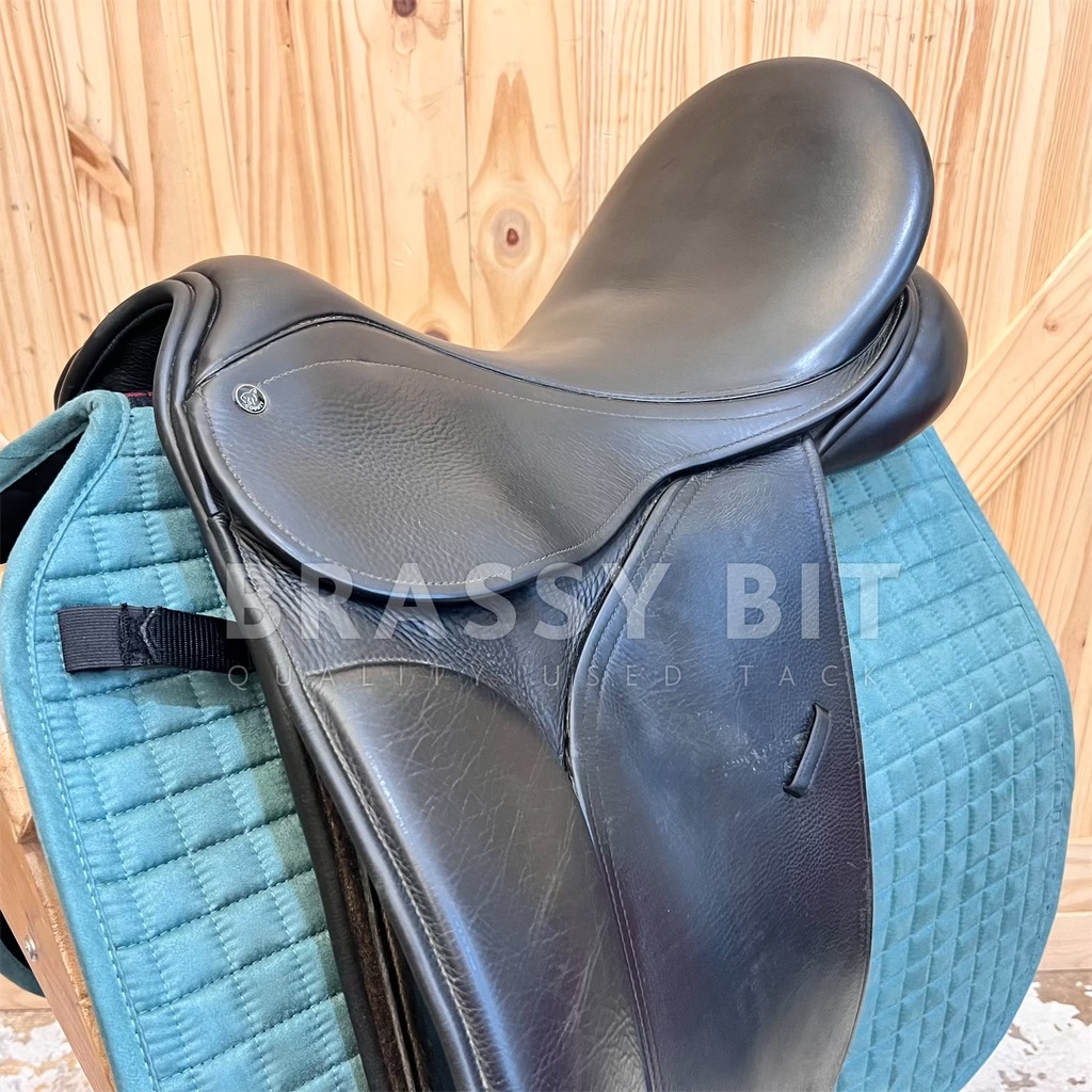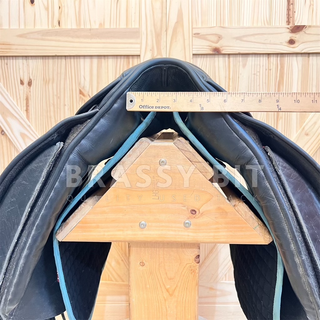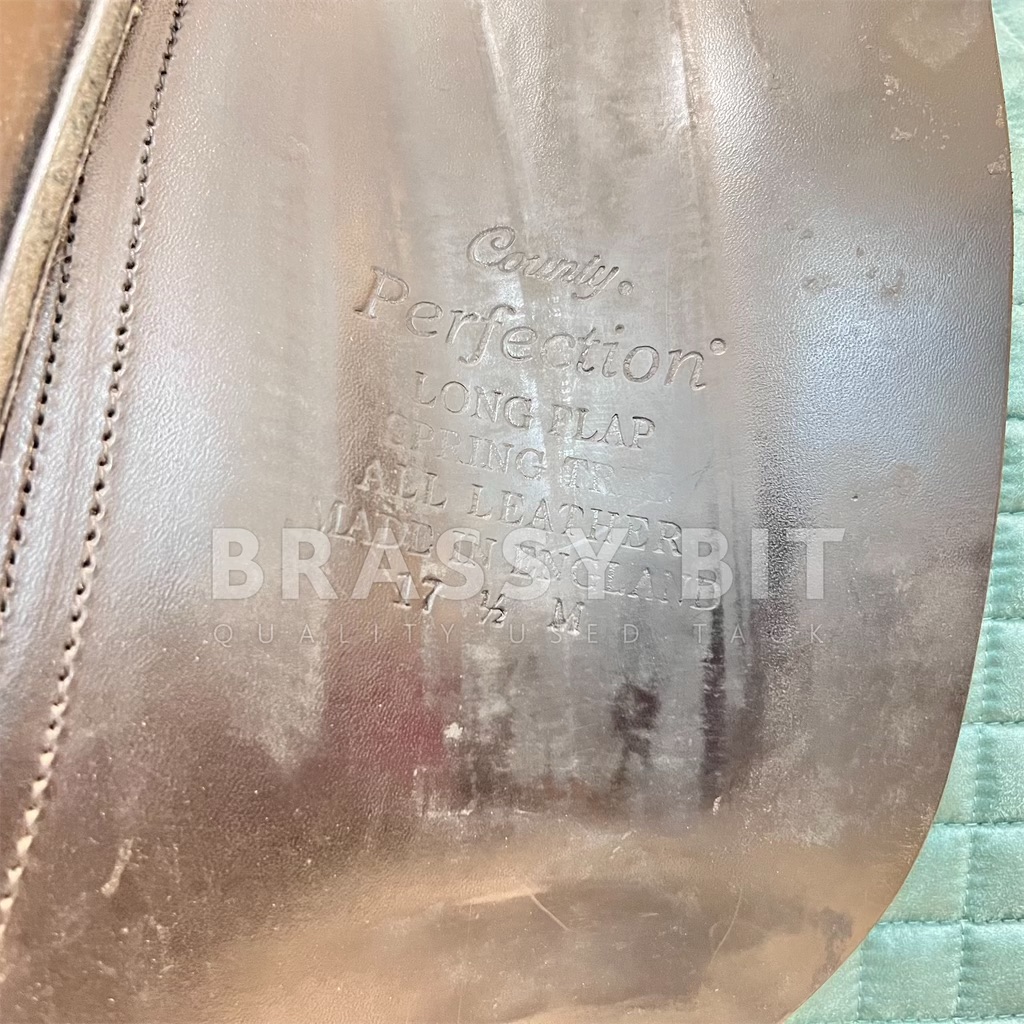 This 17.5″ Perfection by County Saddlery is nothing short of perfection! This saddle is in great used condition and at a great price! Super sticky full grain bull leather, narrow twist, and has been meticulously maintained. Per the flap, this is a Medium, fitting true to that measuring 4.5″, offering ample wither clearance with a more “A” shaped tree. Has shorter tree points with a curvier tree, fitting a horse with a well spring rib cage and stronger wither well. All wool flocked for even more adjustment, offering a bolder rear gusset at 3″, lots of channel width, and a shorter panel at just 19.5″. 17.5″ per serial number, however, this one fits a generously. Special ordered with long flaps that measure 17″. The Perfection has a more forward flap, which is great for a rider who finds themselves putting their knee at the very edge of the knee rolls. Often, the higher end saddles don’t have adjustable blocks. This one does! It has a velcro full flap patch to place knee blocks on. This one comes with a long/moderate block. This is a 2016 model saddle and has been incredibly well cared for and recently went through a total refit. Has brand new billets and brand new wool flocking. Has a quasi point billet currently set, with tabs to have a straight front billet attached if needed. The leather on this saddle is BUTTER soft. This saddle shows far less than normal wear, hardly a mark on this saddle and clearly has been incredibly well cared for. You won’t find many on the market in this condition. This is a lovely saddle, ride in it and you will see why County saddles are so popular!