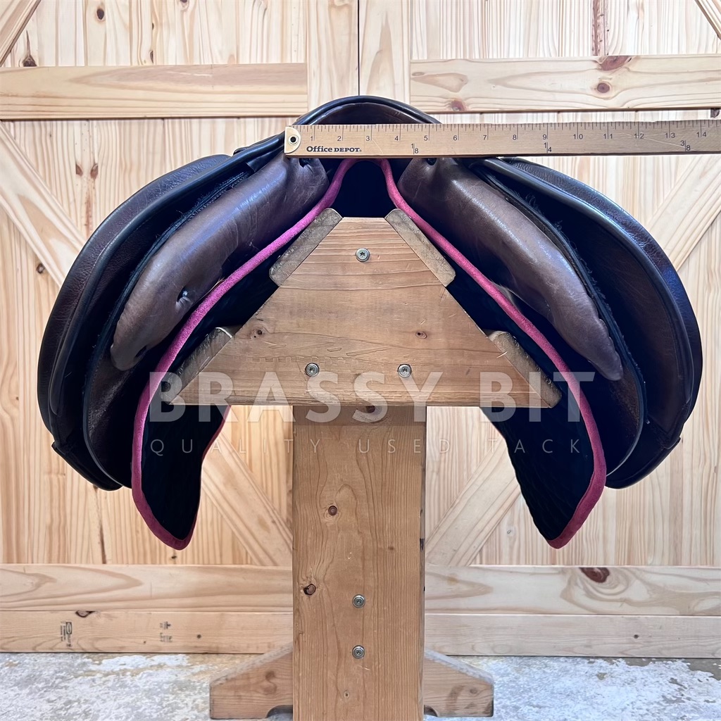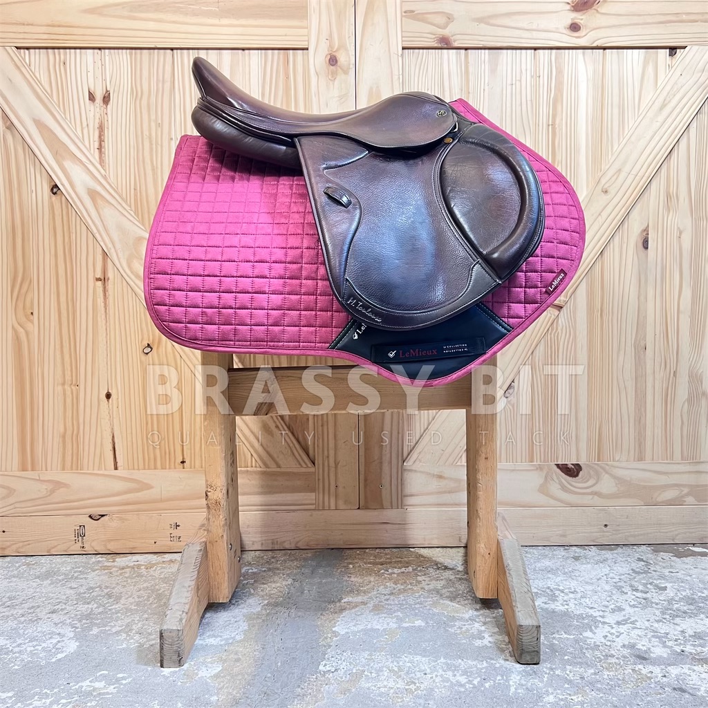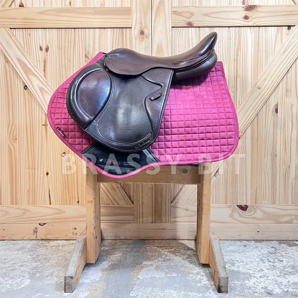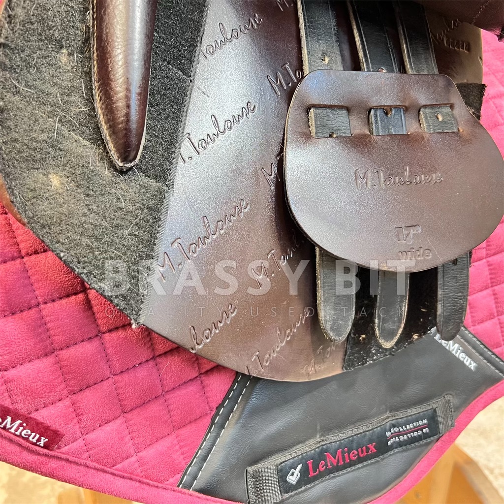 Here is the absolute perfect English saddle to upgrade to. One that is perfectly welcome in the local or breed show ring while still being incredibly affordable. This lovely saddle from M Toulouse was designed by builders who’ve worked with the high end French brands for decades, resulting in this high end look with super grippy calf leather. It both looks and feels swanky! This one is stamped 17″, but measures and fits true to 17.5″ with a more open, almost hunter style seat, very narrow twist and forward flap that measures 13″. The contoured knee roll and adjustable knee and thigh blocks help keep your leg secure. Per serial number, this one is on a Wide tree, fitting true to that with the gullet measuring 5″. Offers a wider channel and a bit of a curvier tree. Very short panel at just 18.5″-this will work for ponies too! This saddle has been very well taken care of. The leather has clearly been oiled often, darkening to a rich chocolate brown and is so darn soft. Shows less than normal use-does have a small bit of superficial stirrup leather rubbing on offside flap. This lovely saddle is both fancy and comfortable. Get this nice, quality used saddle for less than half of its retail price!
