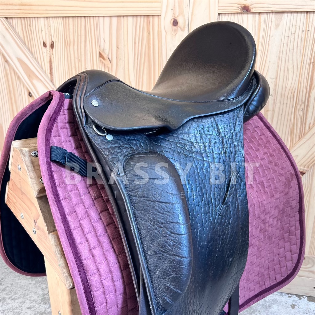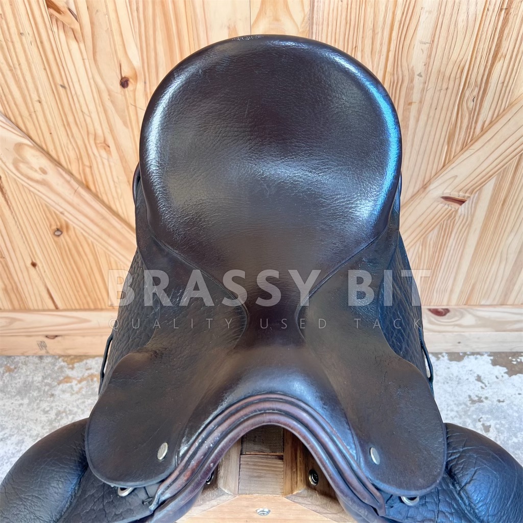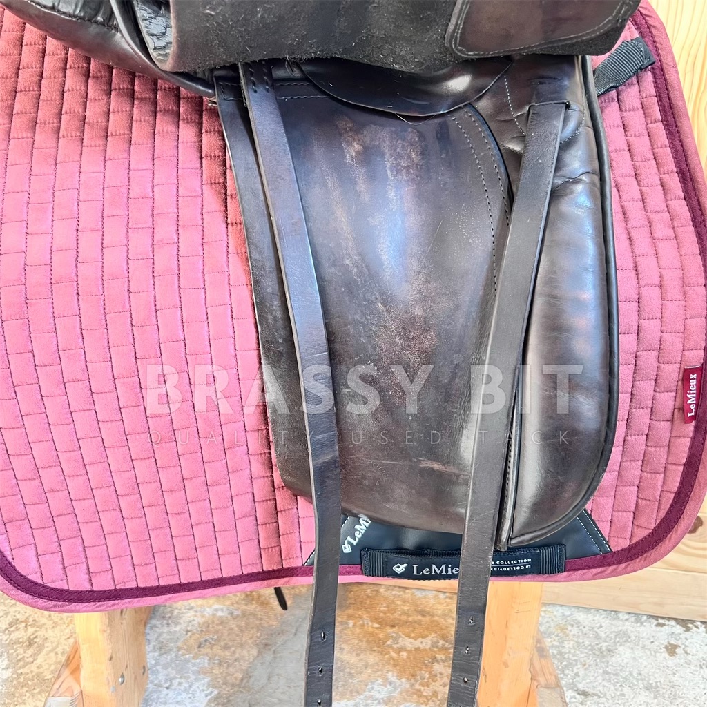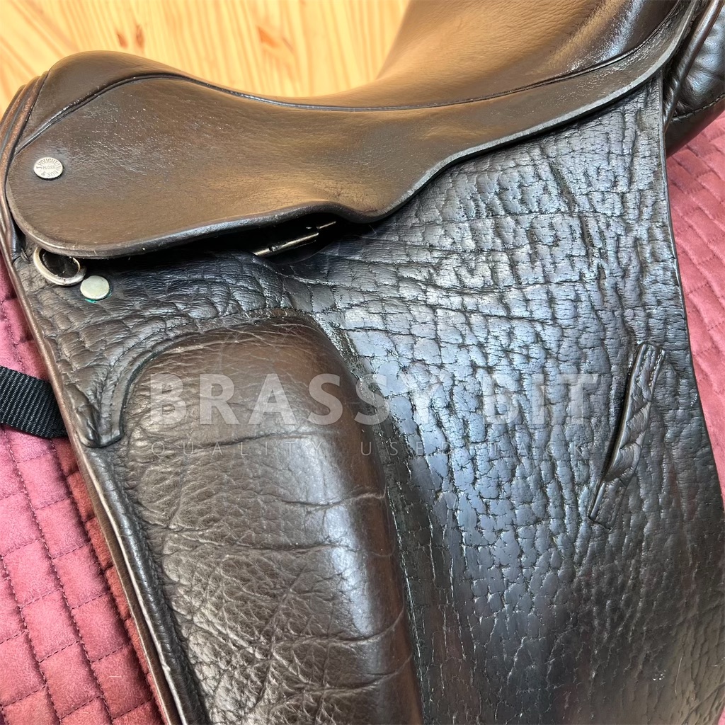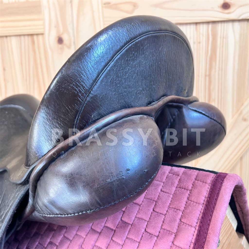 If you don’t recognize this saddle maker, you are not alone. However we are sure glad this saddle motivated us to do some research! J Houghton & Sons, now known as Darwen Saddlers, was started in the late 1800s by William Houghton, and is still run by his descendants today. While J Houghton is more recognizable as harness builders, owners John Thomas and Bryan Galloway have won multiple national and international awards with the Society of Master Saddlers (MSA). This saddle is absolutely incredible! This saddle has all the look of a County Dressage saddle, but has the feel of a custom, high end saddle. Made from a heavier ounce textured leather that is in a rich chocolate brown (yes, its brown!). The textured leather is the same as what County calls XTR leather, that improves grip and we are of the saddle. The flaps and blocks feature this textured leather, with very soft and grippy, very lightly textured leather over the seat. This one is a generous fitting 17″ saddle with a narrow twist, wider seat that is quite scoopy. This saddle sucks you in and keeps you put. Has a high, half length and very bold external block that is wool flocked, offering ample equitation support without being confining. Has a long/low block under the flap. On a Medium tree that measures 5″. Despite the wider measurement, has an “A” shaped tree that offers ample wither clearance with shorter tree points. Moderate channel and slightly larger rear gussets, this one is perfect for a strong shoulders, uphill built horse. Is wool flocked, with the flocking very well maintained. The way the billets are set is great for a horse who needs the full saddle stabilized, with a high forward point billet, and far rear billet, securing the front and rear of the saddle well. Billets are in very good condition. While this saddle isn’t serialized, its clearly been well cared for and hasn’t seen much riding. XTR leather smooths with use, and this one has hardly smoothed from the leathers. Since the leather is a thicker, it appears stiff, but it appears its stiff more from lack of breaking in than neglect or poor care. Has a couple small scuffs, but are minor. Has a more visible scuff on the panel on the near side, but not significant. While you may not recognize the brand, don’t shy away from this one. The details and craftsmanship of this saddle are incredible. The welting is perfectly rolled, hand stitch lines perfectly straight, edges perfectly finished. No wonder the owners of Darwen Saddlers are so well renowned! If this saddle has more ‘brand’ recognition, it would be double the price.
