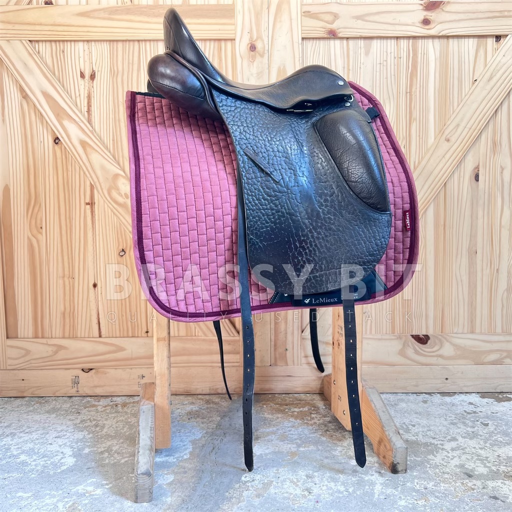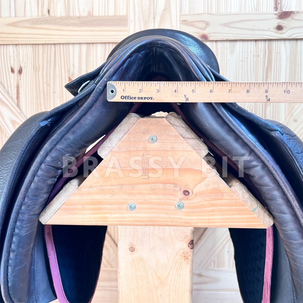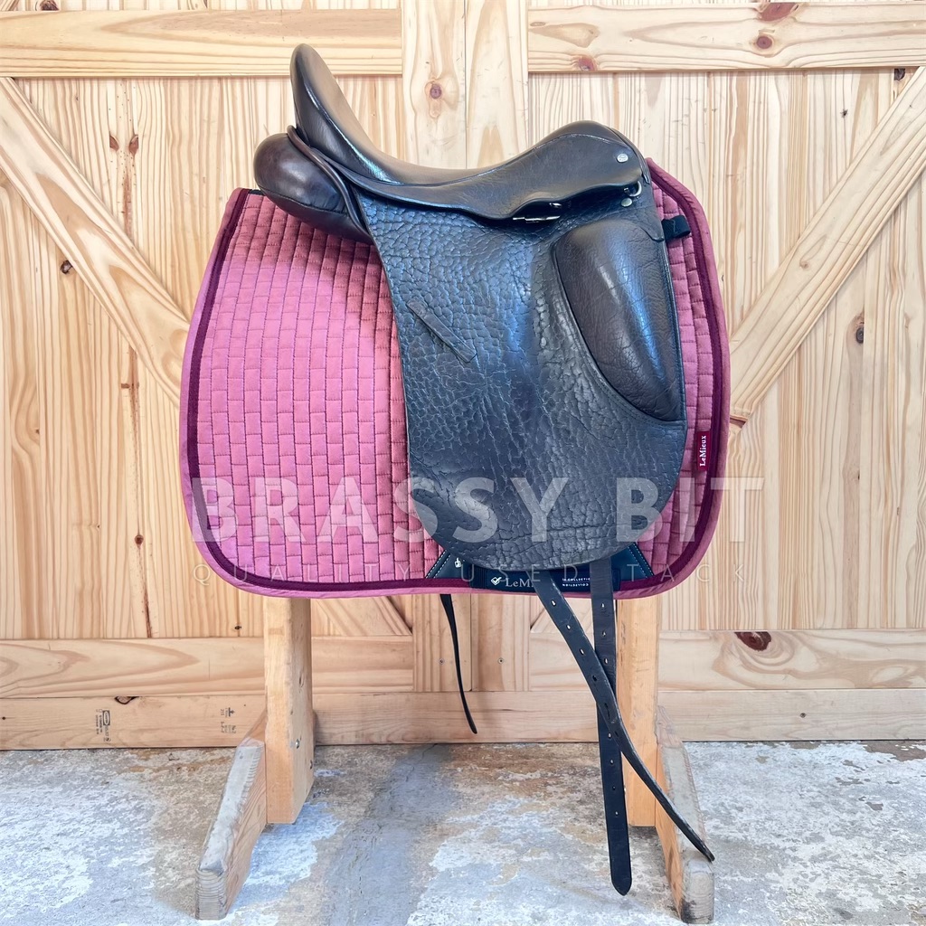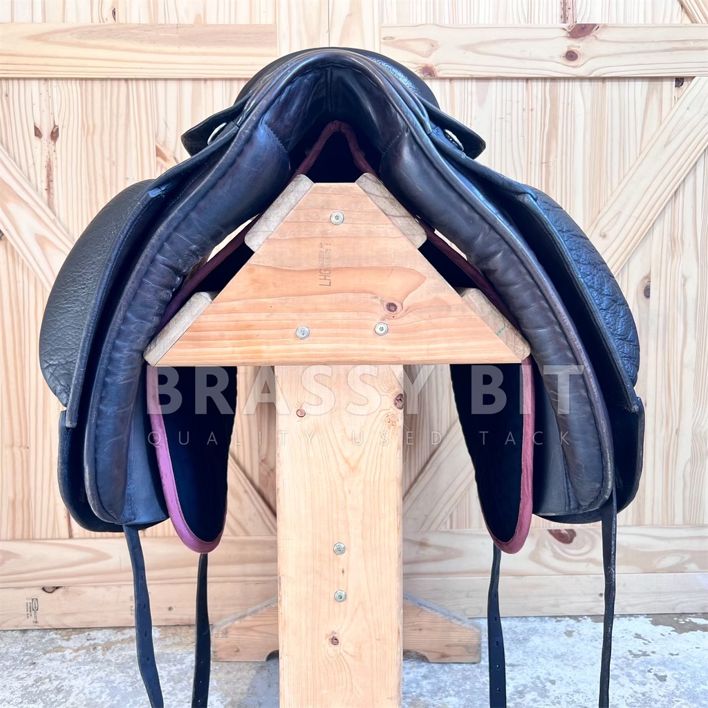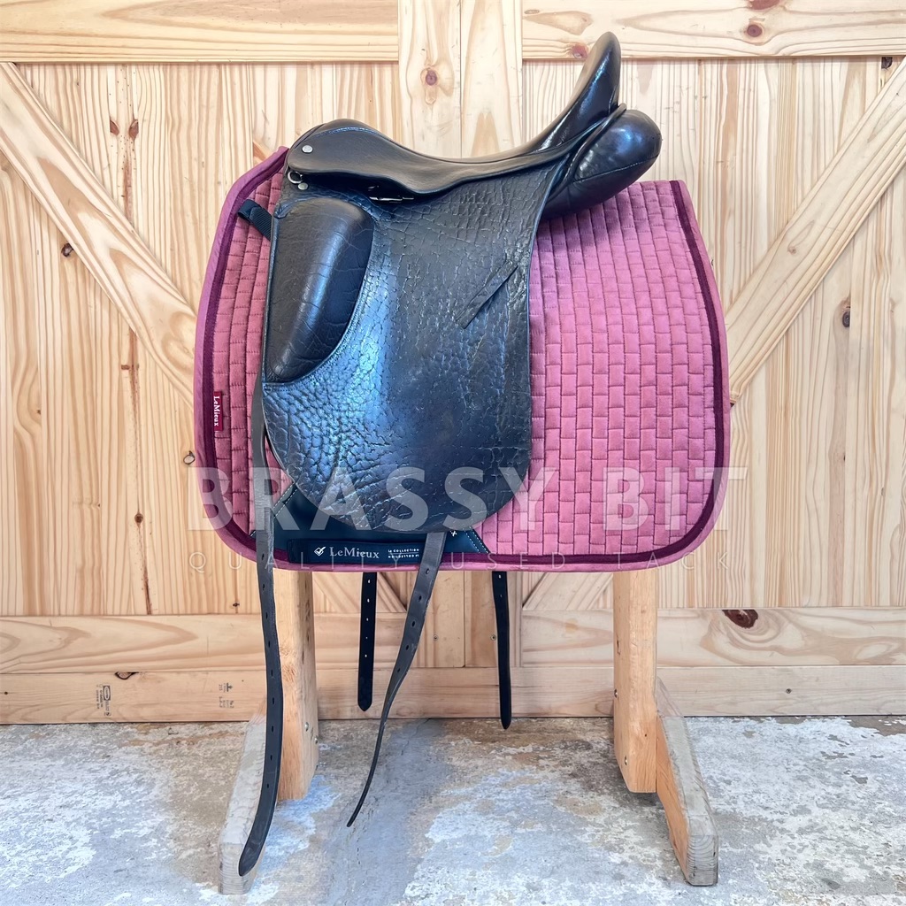 If you don’t recognize this saddle maker, you are not alone. However we are sure glad this saddle motivated us to do some research! J Houghton & Sons, now known as Darwen Saddlers, was started in the late 1800s by William Houghton, and is still run by his descendants today. While J Houghton is more recognizable as harness builders, owners John Thomas and Bryan Galloway have won multiple national and international awards with the Society of Master Saddlers (MSA). This saddle is absolutely incredible! This saddle has all the look of a County Dressage saddle, but has the feel of a custom, high end saddle. Made from a heavier ounce textured leather that is in a rich chocolate brown (yes, its brown!). The textured leather is the same as what County calls XTR leather, that improves grip and we are of the saddle. The flaps and blocks feature this textured leather, with very soft and grippy, very lightly textured leather over the seat. This one is a generous fitting 17″ saddle with a narrow twist, wider seat that is quite scoopy. This saddle sucks you in and keeps you put. Has a high, half length and very bold external block that is wool flocked, offering ample equitation support without being confining. Has a long/low block under the flap. On a Medium tree that measures 5″. Despite the wider measurement, has an “A” shaped tree that offers ample wither clearance with shorter tree points. Moderate channel and slightly larger rear gussets, this one is perfect for a strong shoulders, uphill built horse. Is wool flocked, with the flocking very well maintained. The way the billets are set is great for a horse who needs the full saddle stabilized, with a high forward point billet, and far rear billet, securing the front and rear of the saddle well. Billets are in very good condition. While this saddle isn’t serialized, its clearly been well cared for and hasn’t seen much riding. XTR leather smooths with use, and this one has hardly smoothed from the leathers. Since the leather is a thicker, it appears stiff, but it appears its stiff more from lack of breaking in than neglect or poor care. Has a couple small scuffs, but are minor. Has a more visible scuff on the panel on the near side, but not significant. While you may not recognize the brand, don’t shy away from this one. The details and craftsmanship of this saddle are incredible. The welting is perfectly rolled, hand stitch lines perfectly straight, edges perfectly finished. No wonder the owners of Darwen Saddlers are so well renowned! If this saddle has more ‘brand’ recognition, it would be double the price.