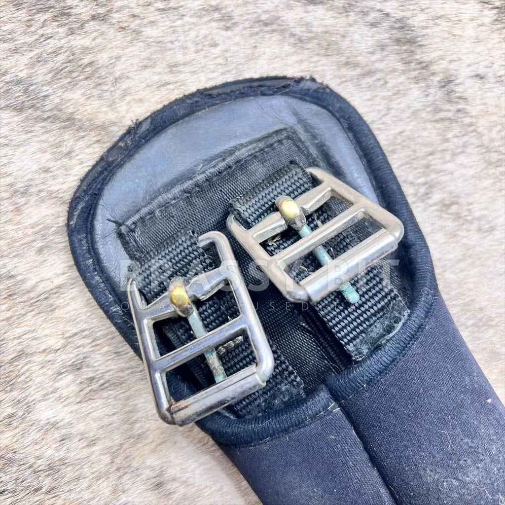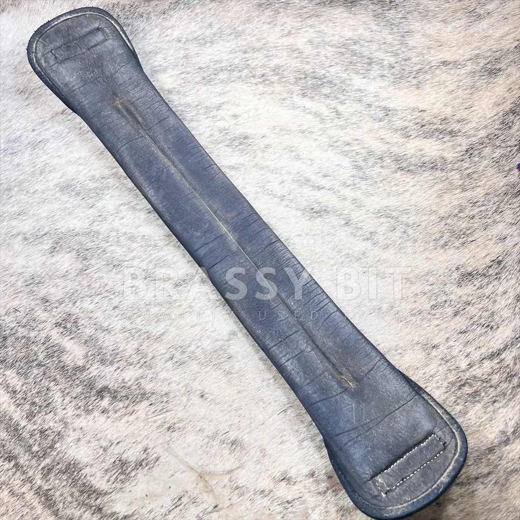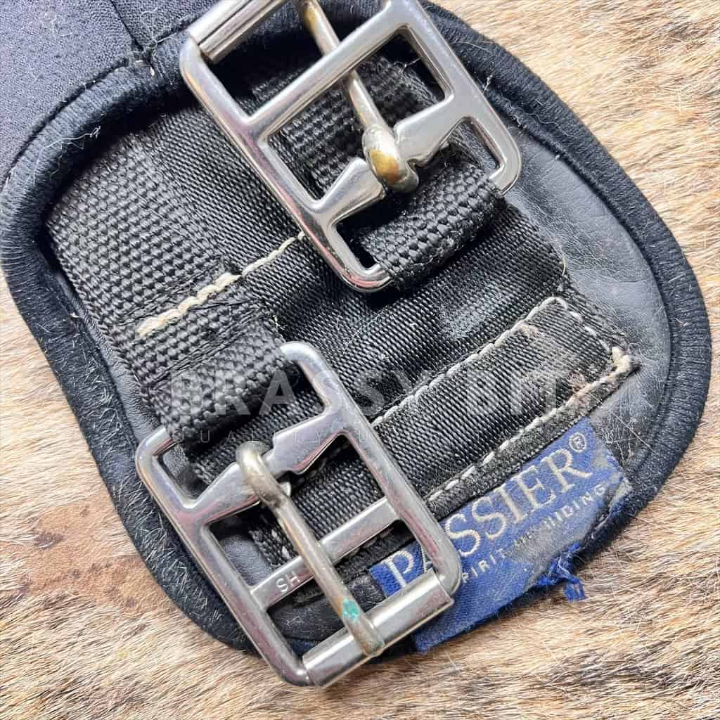 Here is a nice girth in nice condition. From Passier, this girth has a padded, neoprene type material that is quite thick, offering great comfort. Lined behind the buckles, with Herm Sprenger buckles. Single elastic. Overall, this nice girth is in very good used condition, however does show a bit of rubbing at the very end where the billets meet the buckles. 26″ long.