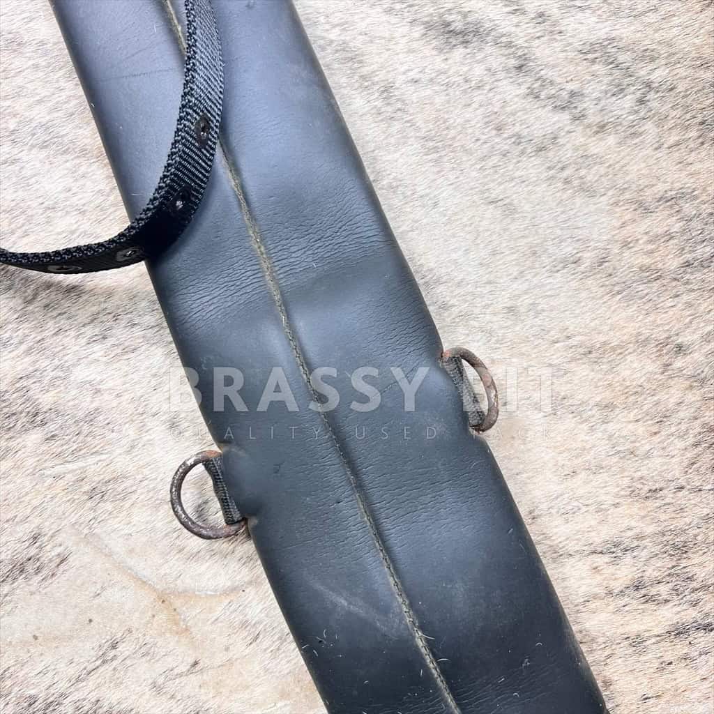Here is a nice, affordable Aussie saddle girth. Great longer size at 39″ (Measured buckle to buckle) wider at 4.75″, and offers wider roller buckles. Comes with attached billet, which many Aussie saddles require, but could easily be tucked in if not needed. In black, made from a heavily padded and squishy neoprene material. These wider buckle girths are also popular girths for surcingles and bareback pads. While we are not familiar with this brand (Fabri-Tech), this is clearly a well made piece of tack. In good used condition, showing minor signs of use. Does show rust on the buckles from storage. Nice, affordable Aussie girth!