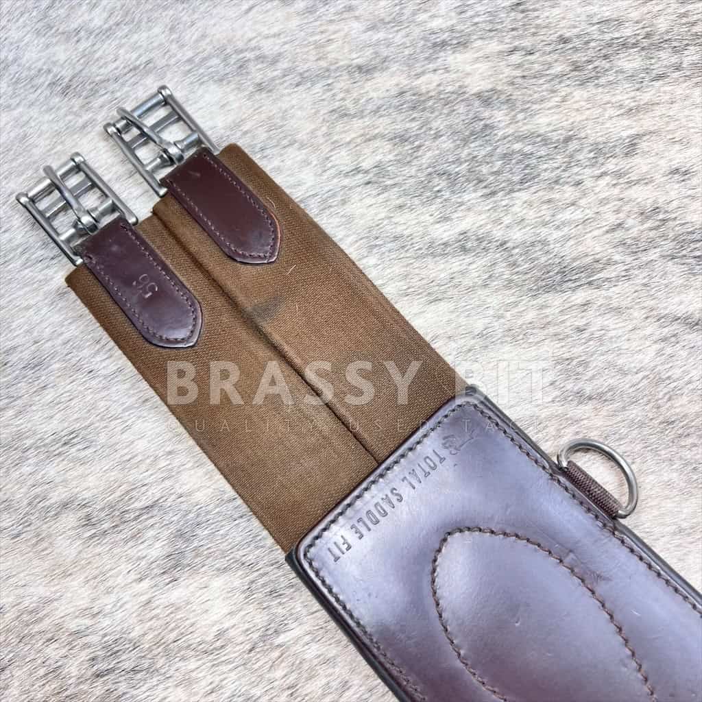 Here is a really nice, lightly used 56″ Total Saddle Fit girth. In a rich chocolate brown, offers double elastic on each side with roller buckles, and a soft leather liner. Liner is not removable. This girth is in very good, well cared for condition. Showing minor signs of use. This size has been discontinued by TSF, so they are getting hard to find! Here’s a great opportunity to get a longer girth and offered far less than the retail price!