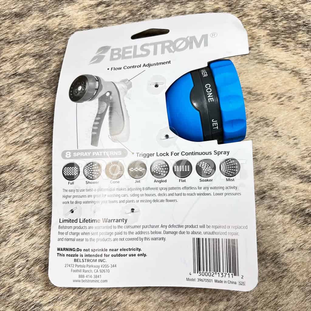 Here is a heavy duty 8-pattern/option hose trigger nozzle from Belstrom. When we say heavy duty, we mean it. This nozzle is our ‘go to’ and is durable enough to survive the attention of our naughty/destructive baby horses. Ergonomic grip handle with stop and surprisingly lightweight. Great for gardening, bathing horses, filling water buckets, and more. Finally, a nozzle that will actually last! Will fit standard hoses. New!