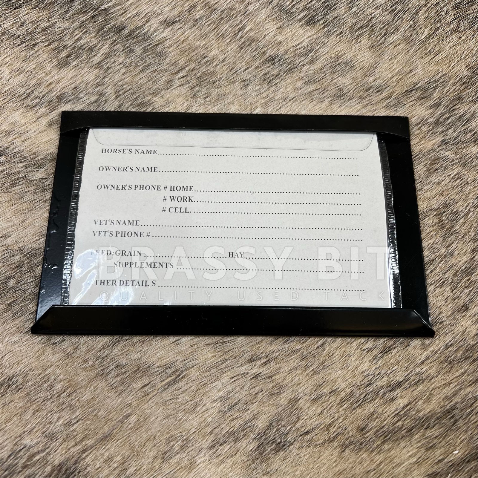 Just the thing you didn’t know you needed! New without tags in black metal, this stall card holder has a slot with a card that captures all the info you could ever needed for your horse. Perfect for a horse in a boarding setting. Can easily have another card put in the card holder. Heavy duty, easily hung. New without tags/new old stock, so may show a few scuffs from storage.