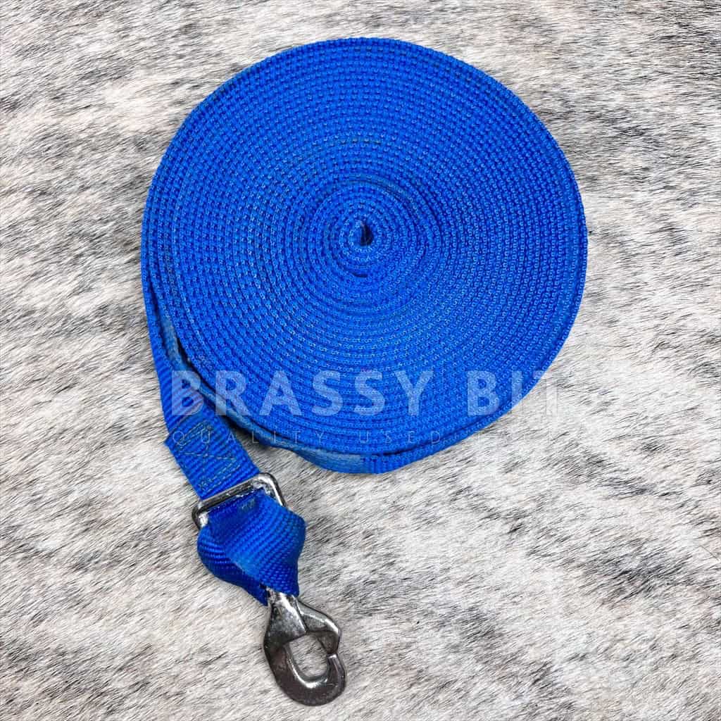 Here is a nice, nylon flat lunge line in blue. Has a loop through end that could easily be switched out for a different buckle. Currently has a quick snap on it. 24′ long, 1″, and is quite soft. In very good used condition. Does have a name written in marker. Marker is blue so its very faint.
