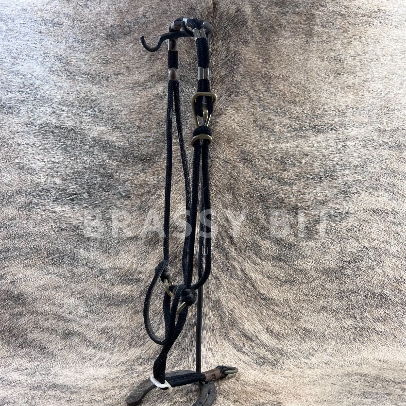 Here is a great addition to you training tack line up. In used condition from Be Nice Halters, made for Colorado Saddlery. Is horse size, but fits lime small horse size, but not quite cob, in black, that pulls over the head and is super adjustable (no clip or tie). These halters have metal raised points on the crown to help a horse release to pressure and stop pulling back when tied. This one has seen some use, but is in good used condition. Shows some dirt on the inside of the halter, some tarnish to the rings, and a teeny bit of surface fraying in a couple spots, but solid and safe. Per Be Nice: