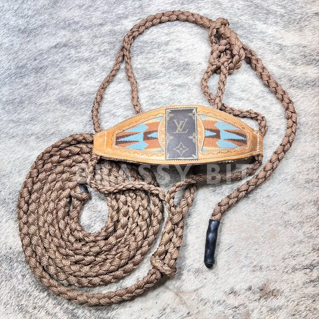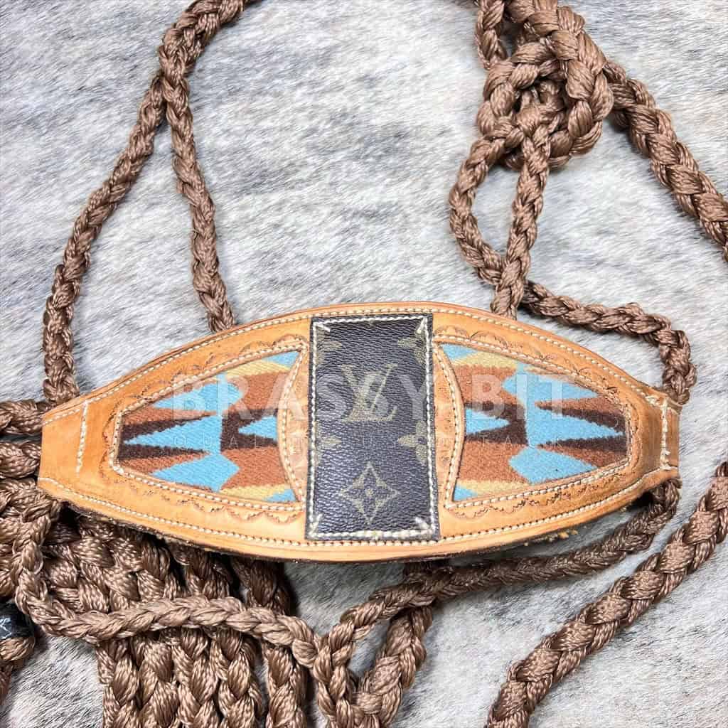 How cool is this custom halter! Made by the incredibly talented Midnight Ranch Co, this mule tape style halter has an absolutely stunning, unique, and fully handmade wide/bronc noseband with Hermann Oak leather, real Pendleton wool and LV leather inlay. No, we are not spelling out “LV” as we are not going to get sued–we don’t make enough to pay for those kind of lawyers (if you know, you know). According to the maker, the LV leather is authentic, repurposed pieces–but, again, we are not going to speak to that. Ok, enough of all that legal language, this halter is absolutely stunning! Horse size, offers a ton of adjustability, and is one that is sure to get you noticed. In excellent, very, very lightly used condition. Offered for way less than retail!