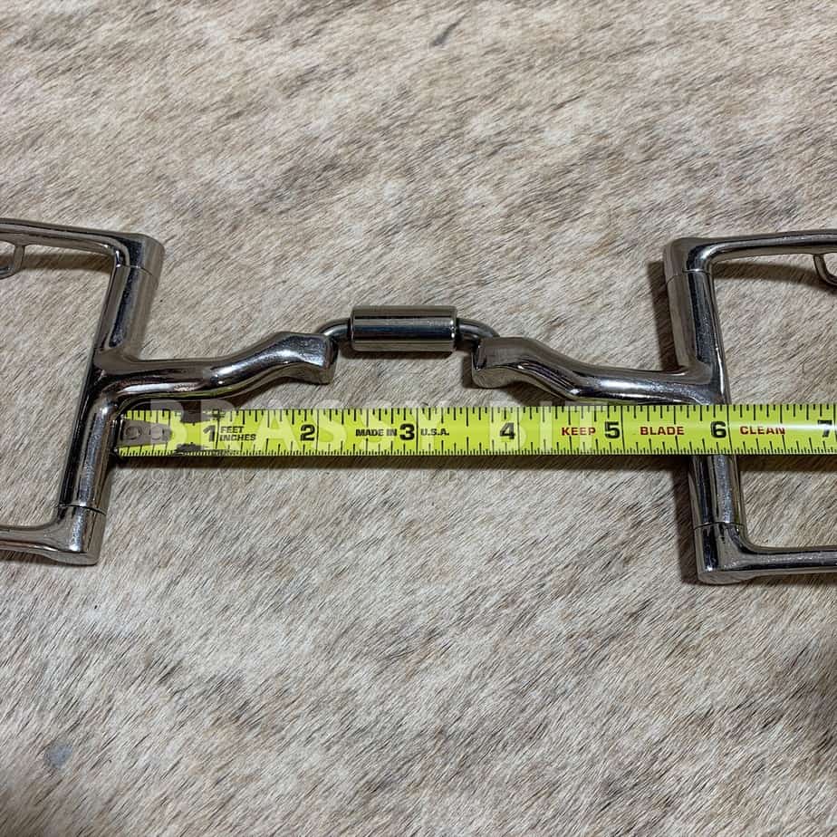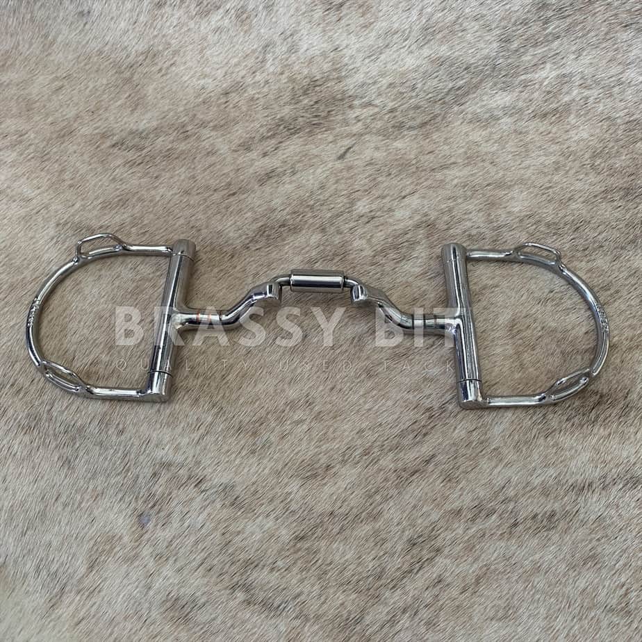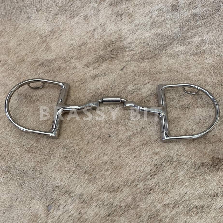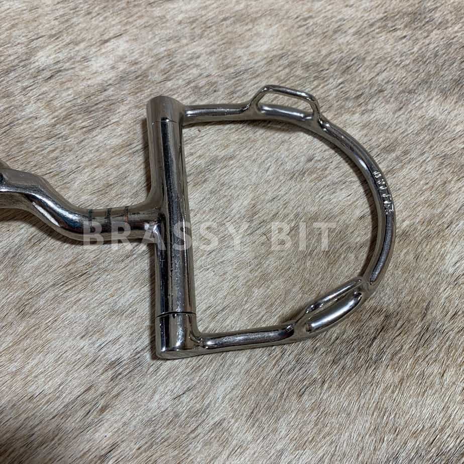 New without tags 5.25″ Stainless Steel D Ring with Hooks with Stainless Steel Ported Barrel (MB 41PB, Level 3) Copper Inlay. Level 3 with a correction port that offers some tongue relief, hooks for mild leverage option, and a point that offers an option for a curb chain. This bit allows the rider/horse pair many options for their training needs. Has inlayed copper to promote salivation. This is a discontinued model, as the newer version of this model has a smaller roller and straighter mouth piece. Please note that Myler’s with a more anatomical mouth will measure a bit larger laying flat. Fits like a 5.25″. Per Myler: