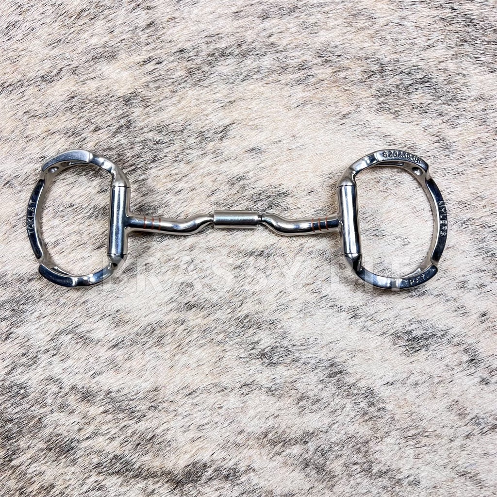 Here is a great, older style 5.25″ Myler Eggbutt Low Port Comfort Snaffle (MB04). This is a very popular option for horses who need the stability of a mullen mouth and who don’t care for the nutcracker effect of traditional snaffles. Eggbutt, with slots (hooks). With the slots in the cheek pieces rather than outside make this one that can be used like a sliding gag bit, an older and very popular style for the hooks/slots. In very good used condition, shows very minor teeth marks in a couple spots. Nice, slightly larger size too. Per Myler: