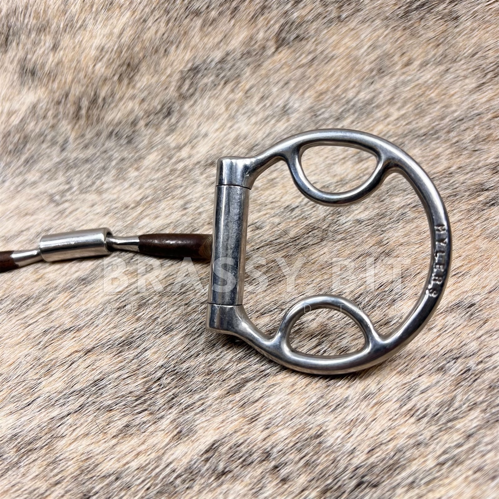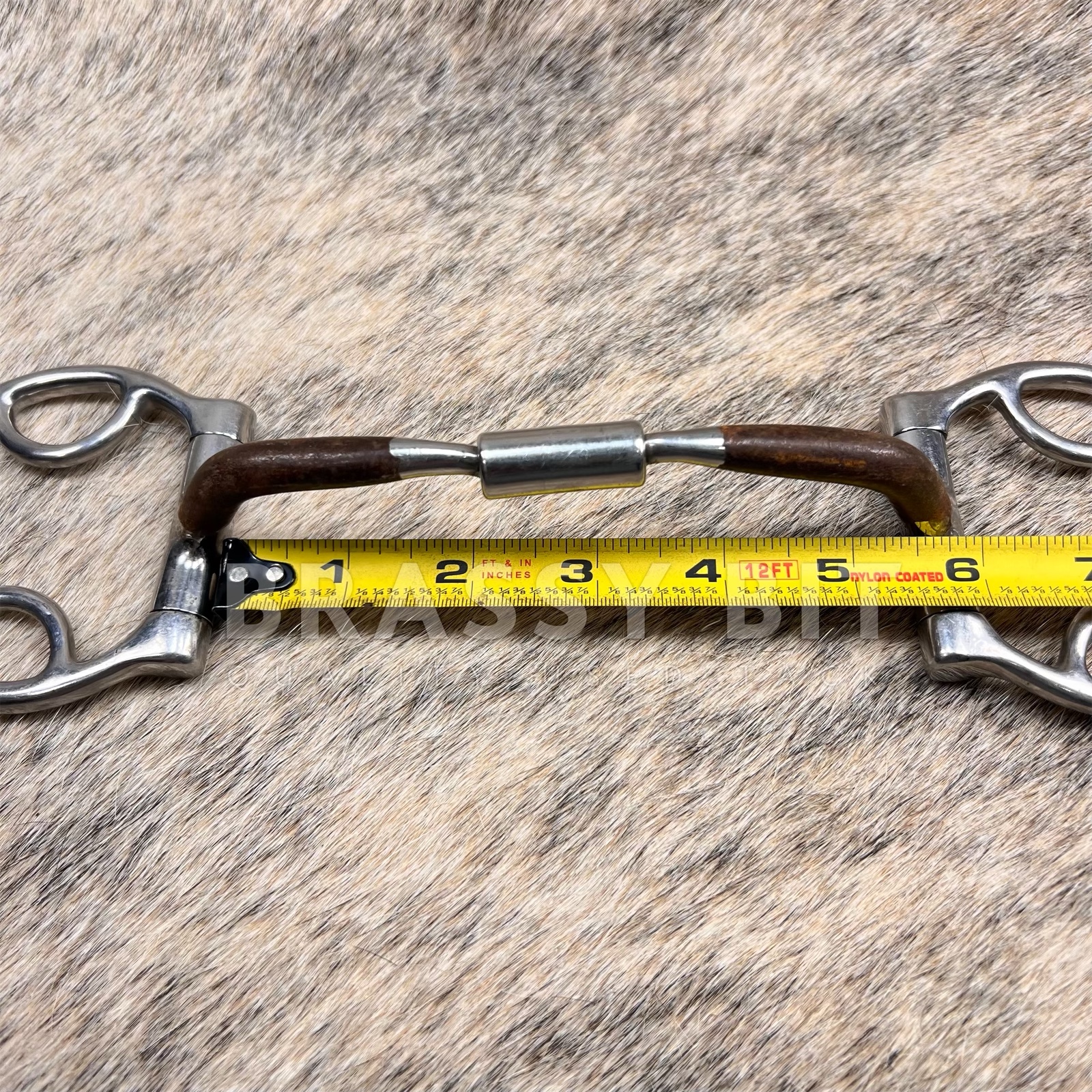 This bit has our absolute favorite mouth from Myler. The comfort snaffle mouth offers great anatomical support, ample tongue relief to make this even more supportive of your horse. This 5″ Myler Western D Comfort Snaffle (MB 03) is in good used condition, with hooks that give the rider mild leverage options. The mouth is made from sweet iron, which rusts with use to offer a pleasant taste for your horse. This one is just starting to rust. Per Myler: